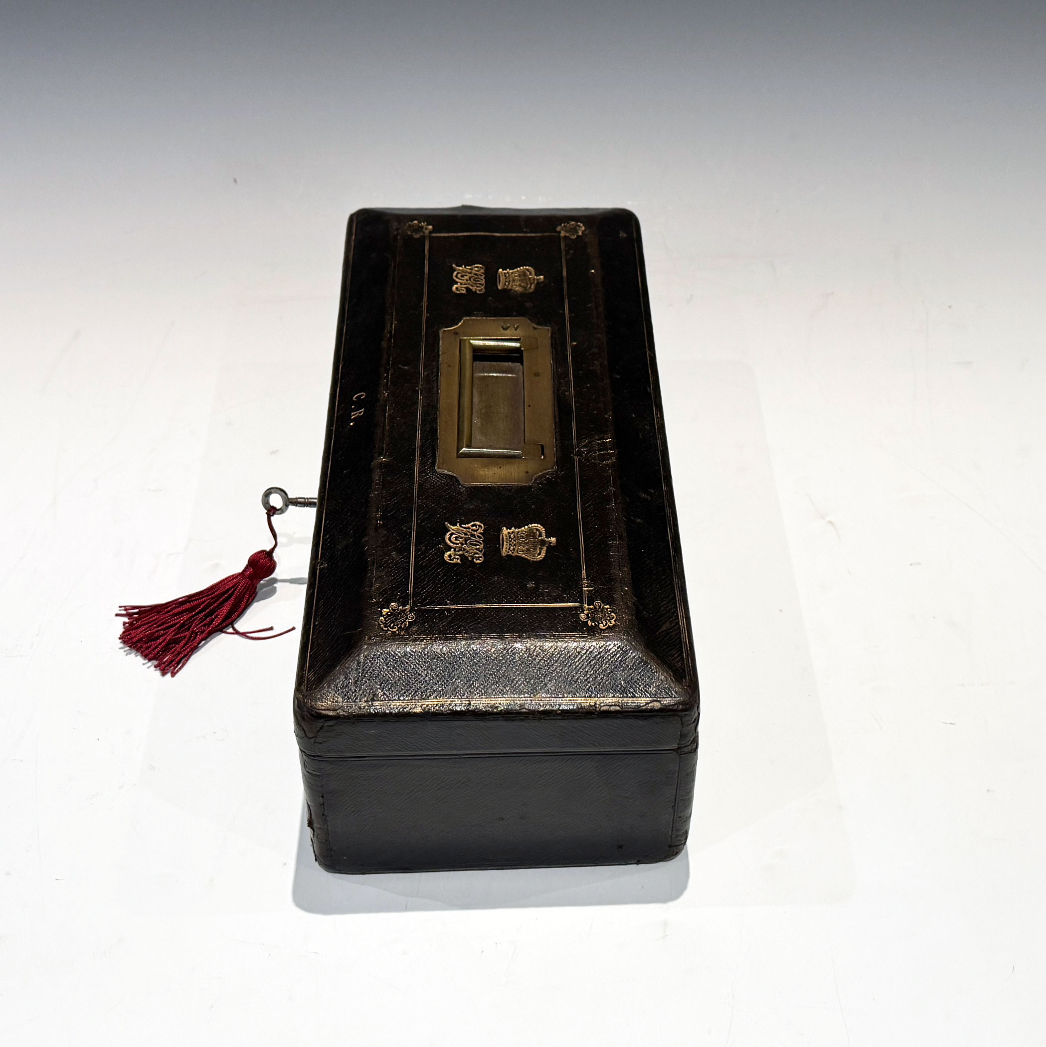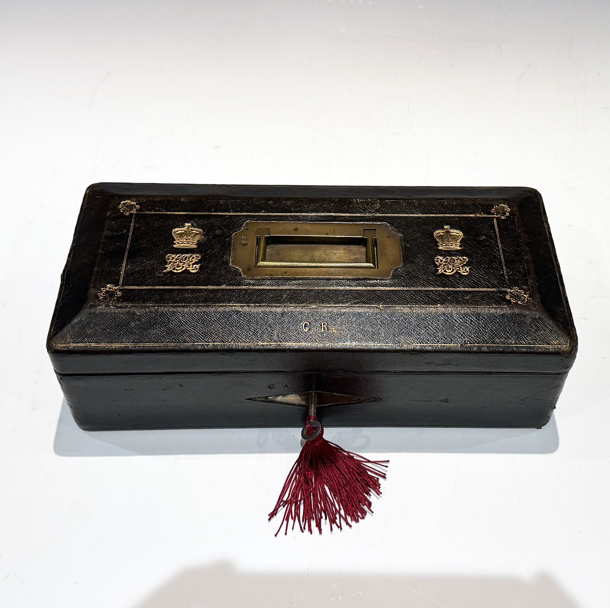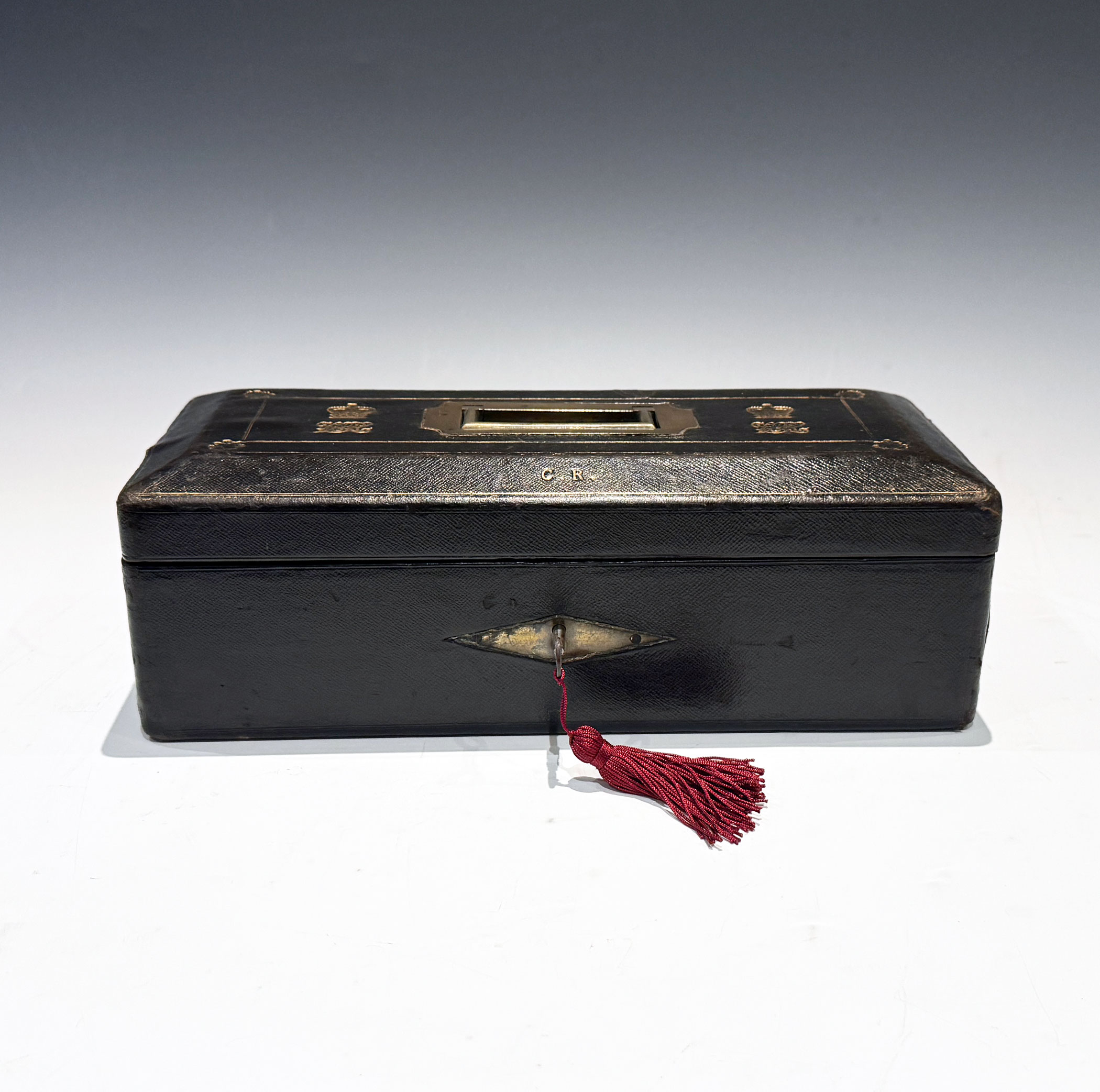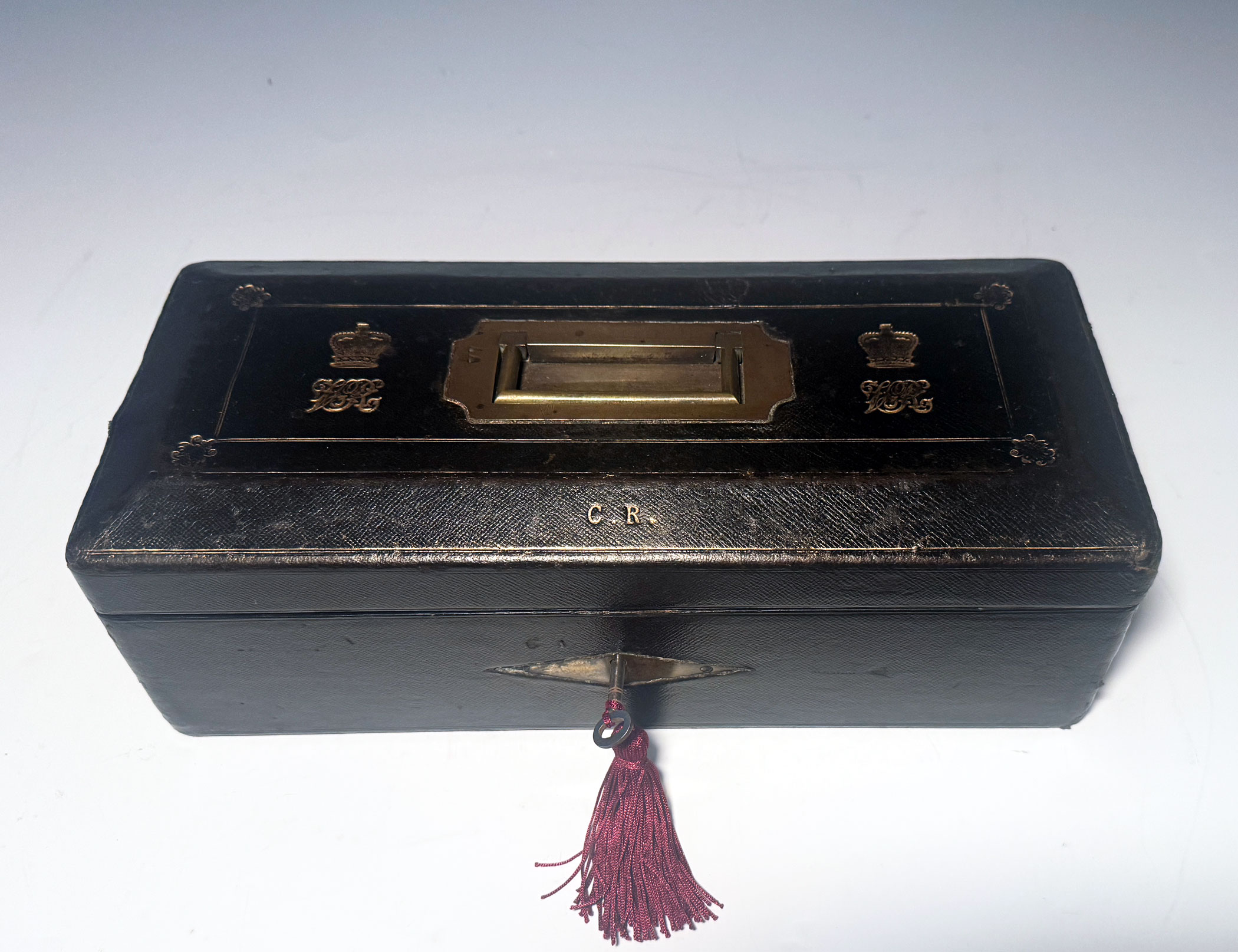A Victorian Black Morocco Despatch Box, The bevelled top with gilt lines and a recessed brass handle, flanked by twin gilt embossed Royal cyphers, the initials C.R. forward displayed above the rhomboid key escutcheon.