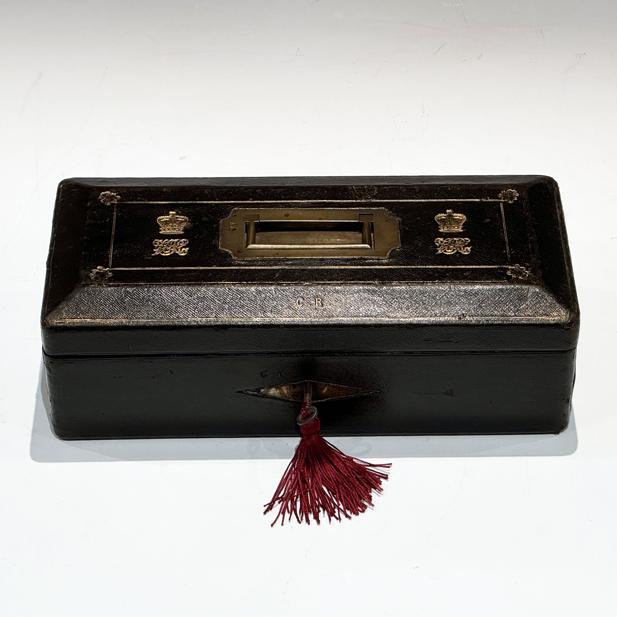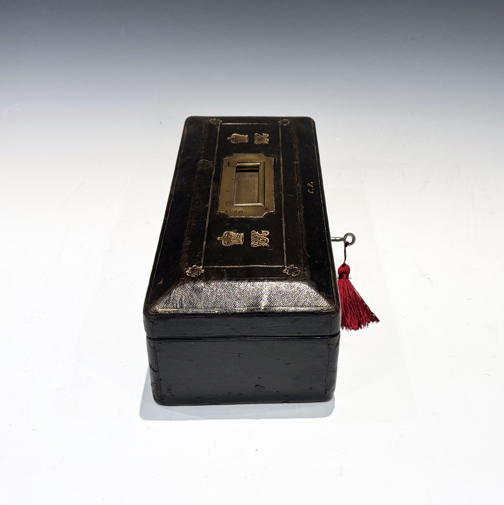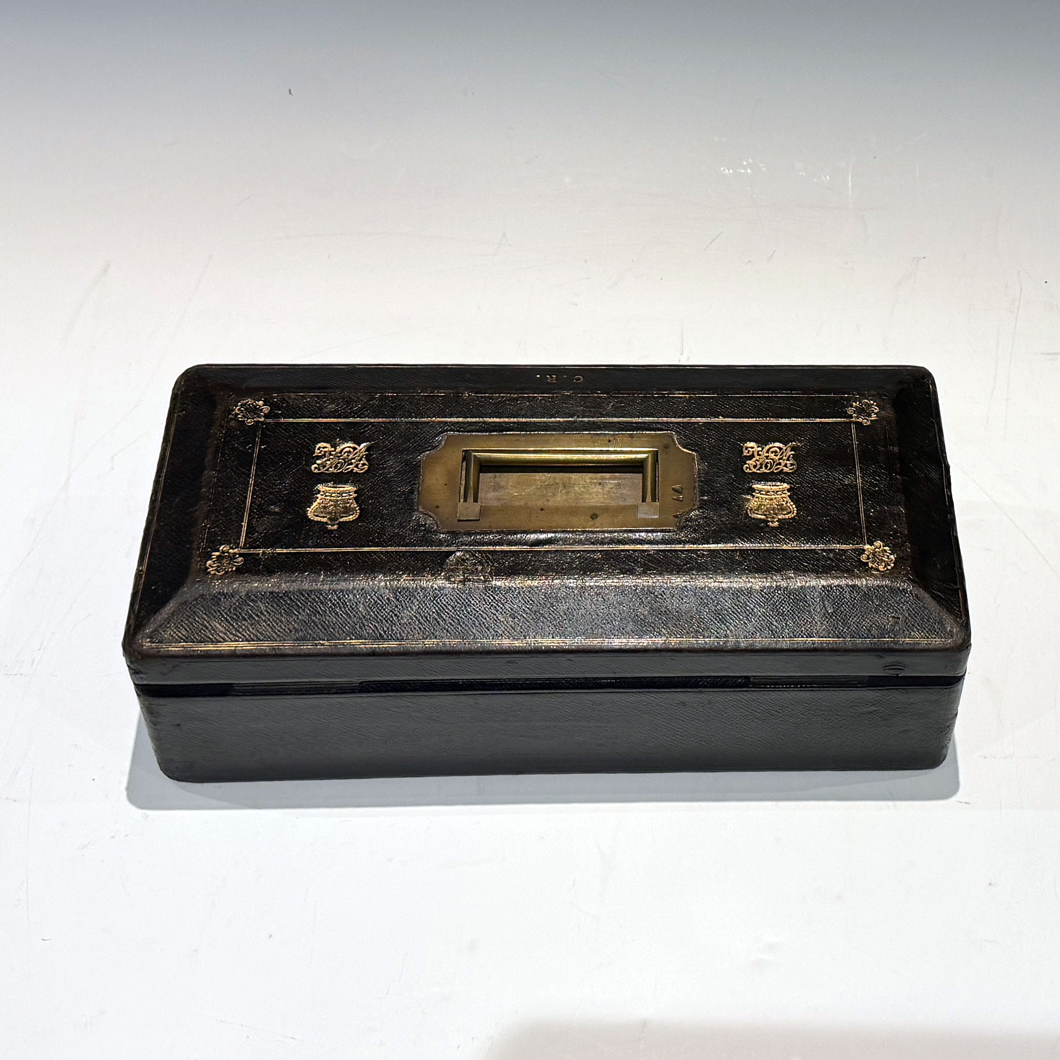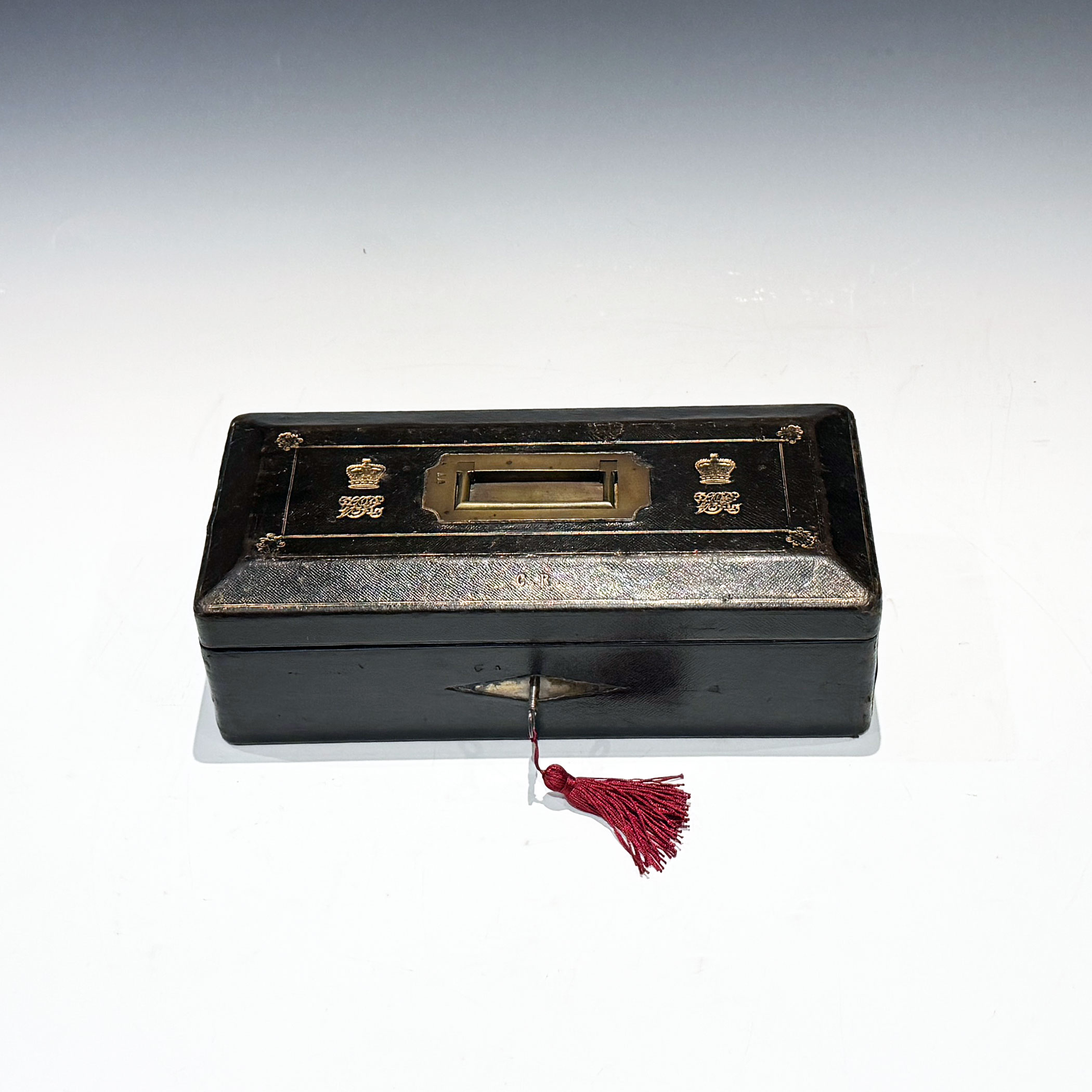 A Victorian Black Morocco Despatch Box, The bevelled top with gilt lines and a recessed brass handle, flanked by twin gilt embossed Royal cyphers, the initials C.R. forward displayed above the rhomboid key escutcheon.