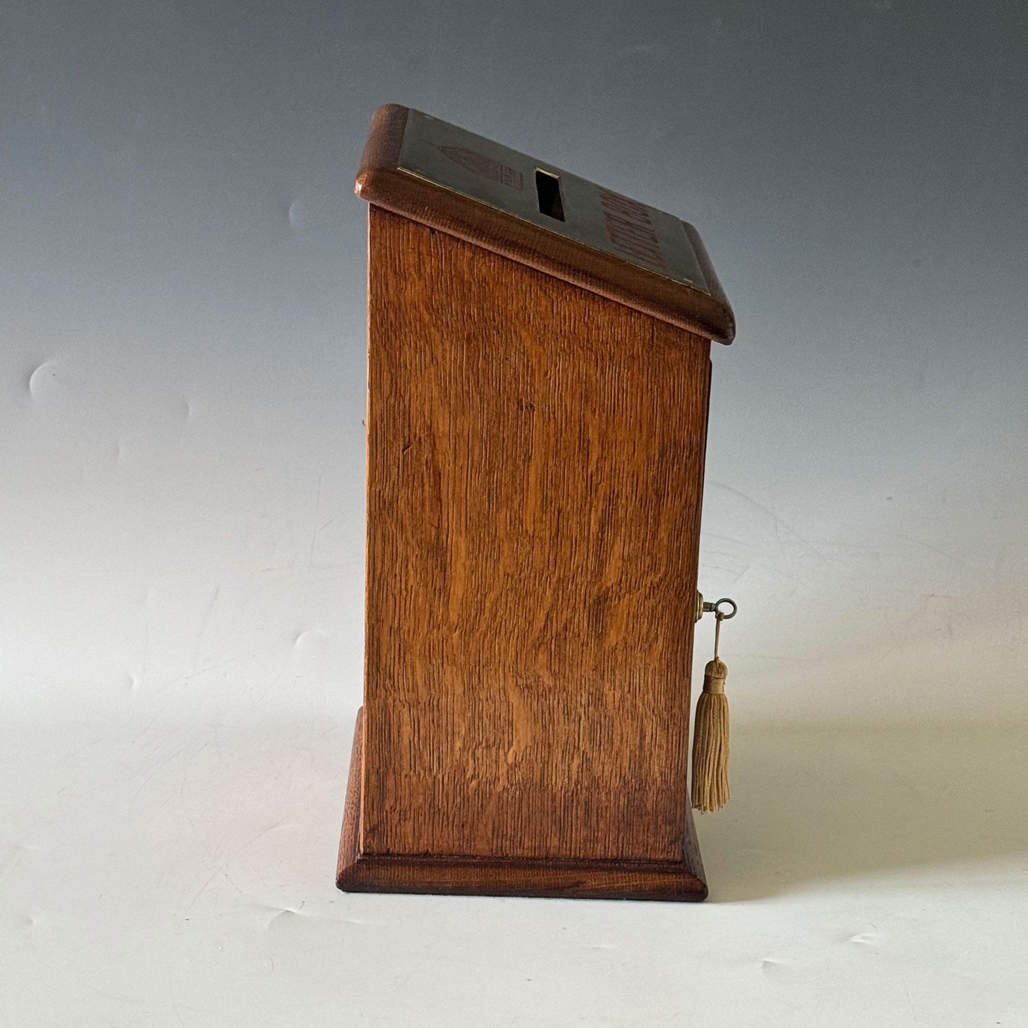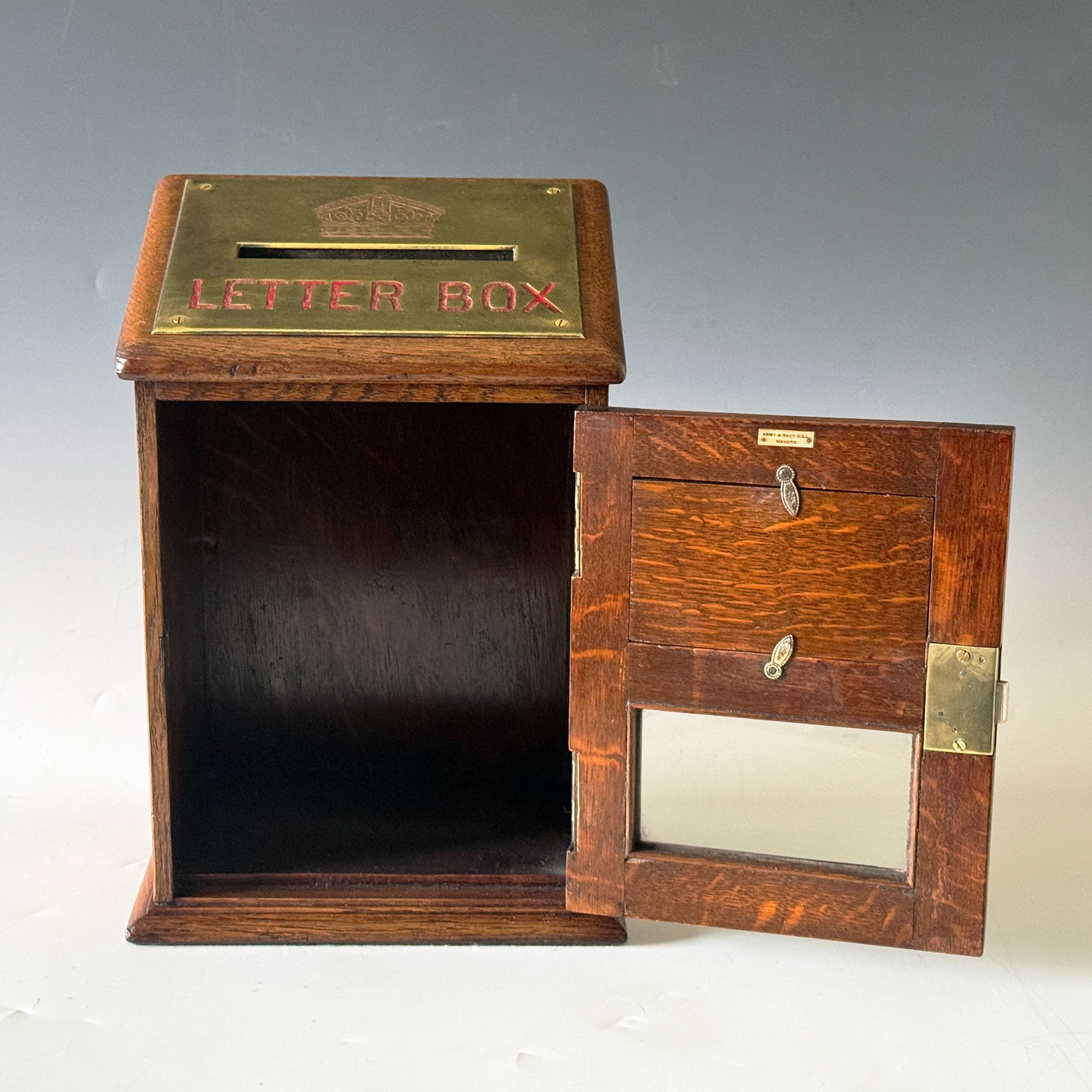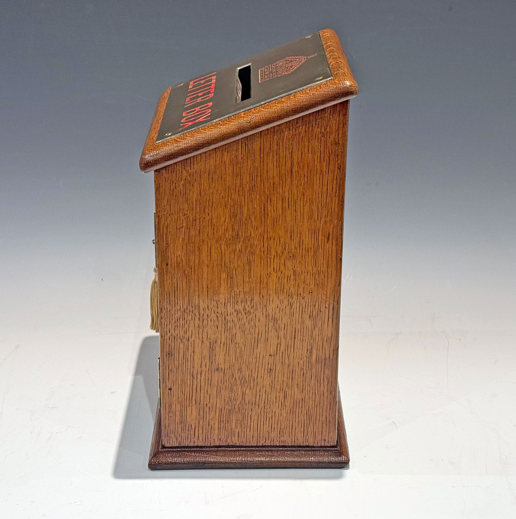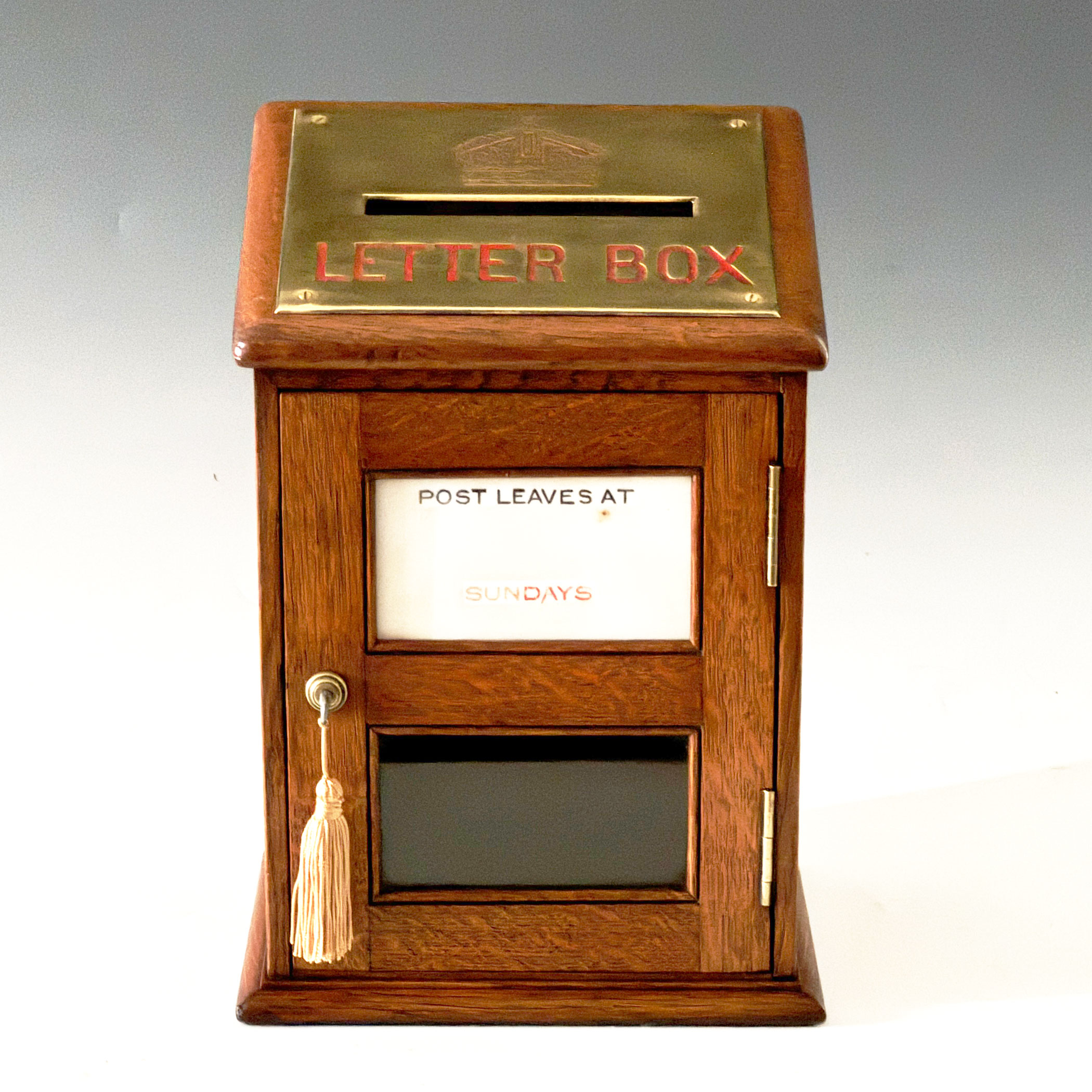 A Fine Edwardian Oak Domestic Post Box, the sloped top bearing a brass panel engraved with a representation of King Edward VII's crown above the postal slot and engraved 'LETTER BOX'.