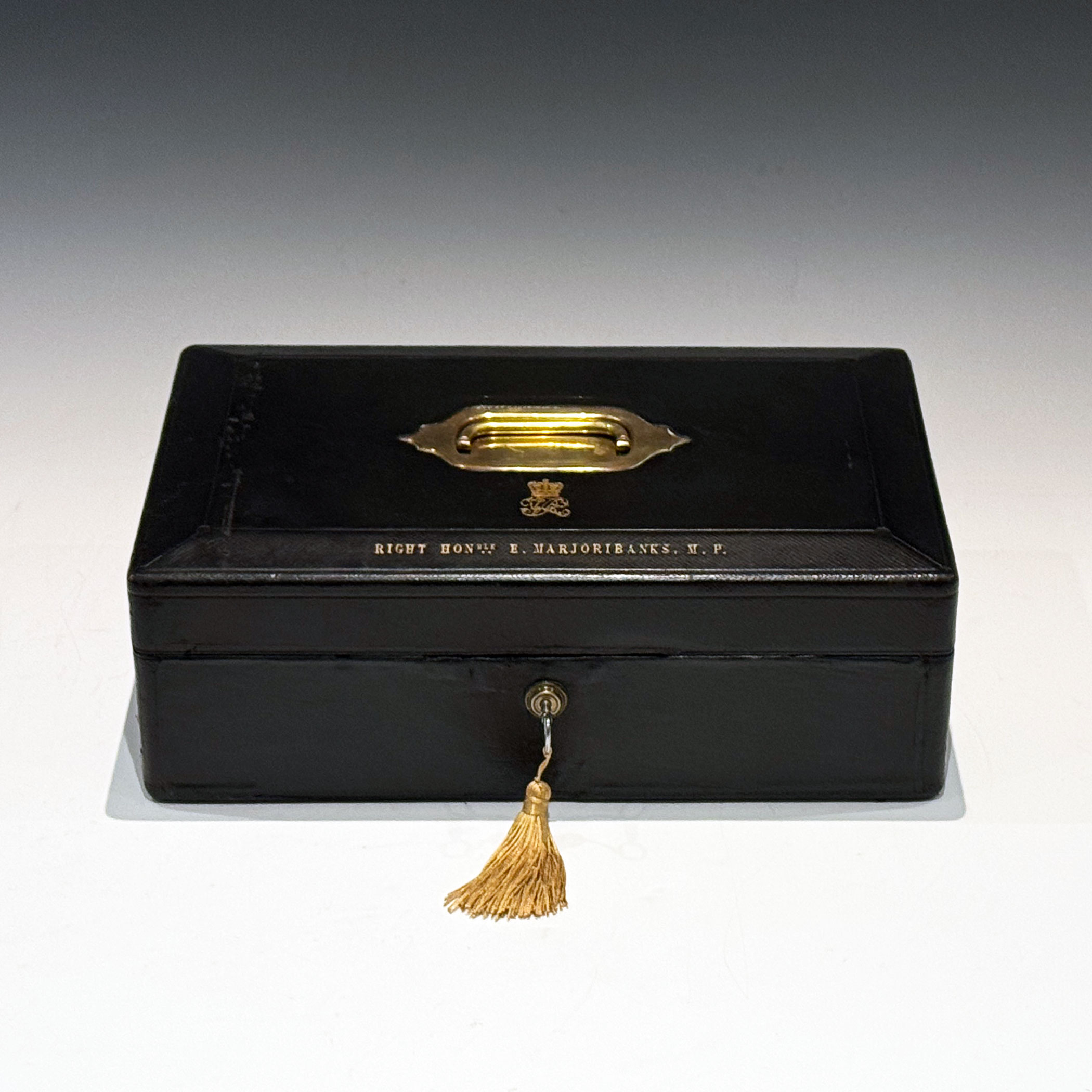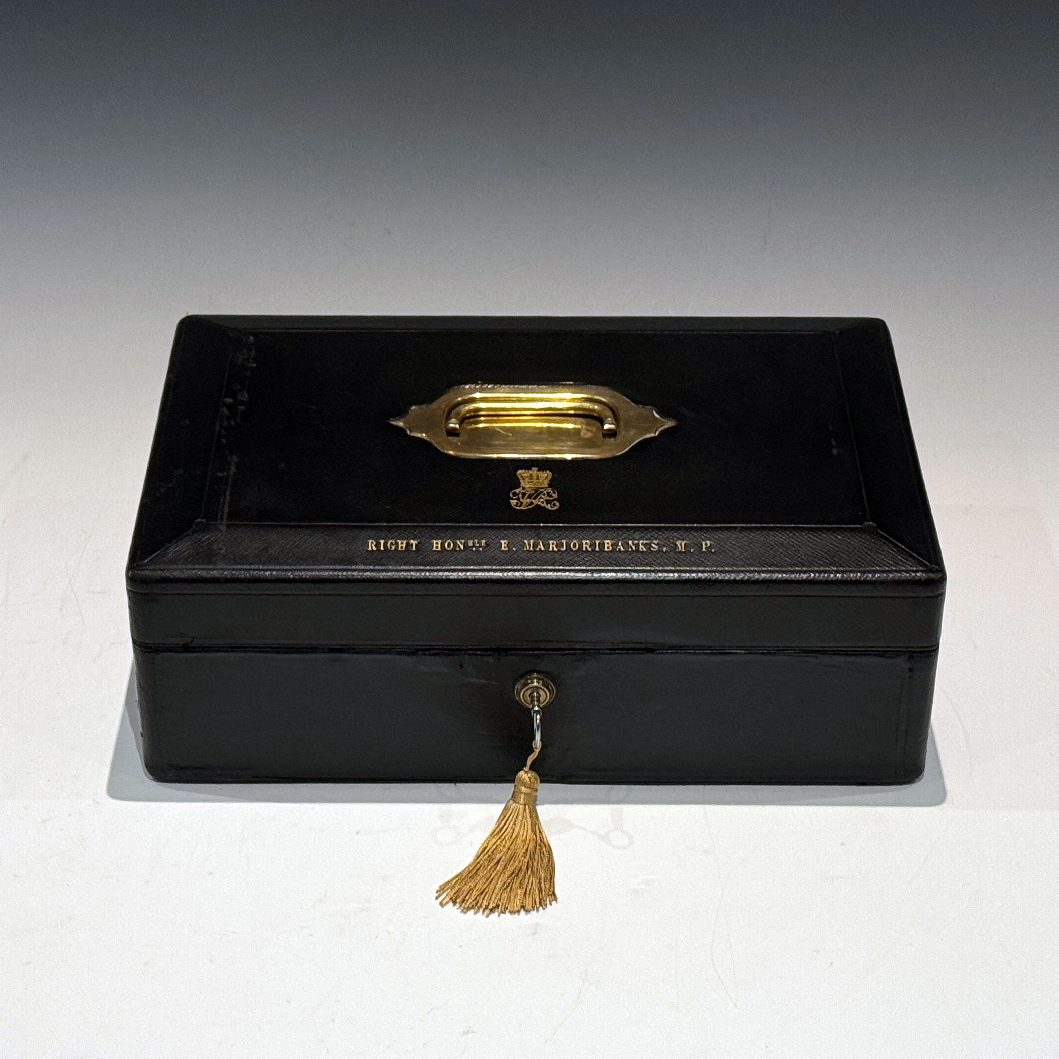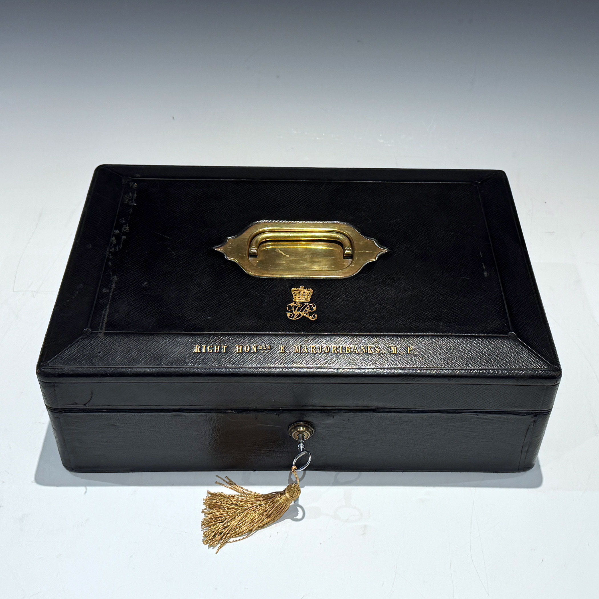 A well-proportioned Victorian Black Morocco Leather Clad Despatch Box the bevelled top, mounted, with a central recessed brass handle, is embossed with the royal cipher of Queen Victoria. The front bevel bears the name & title  'The RIGHT HON. E. MARJORIBANKS. M.P.'