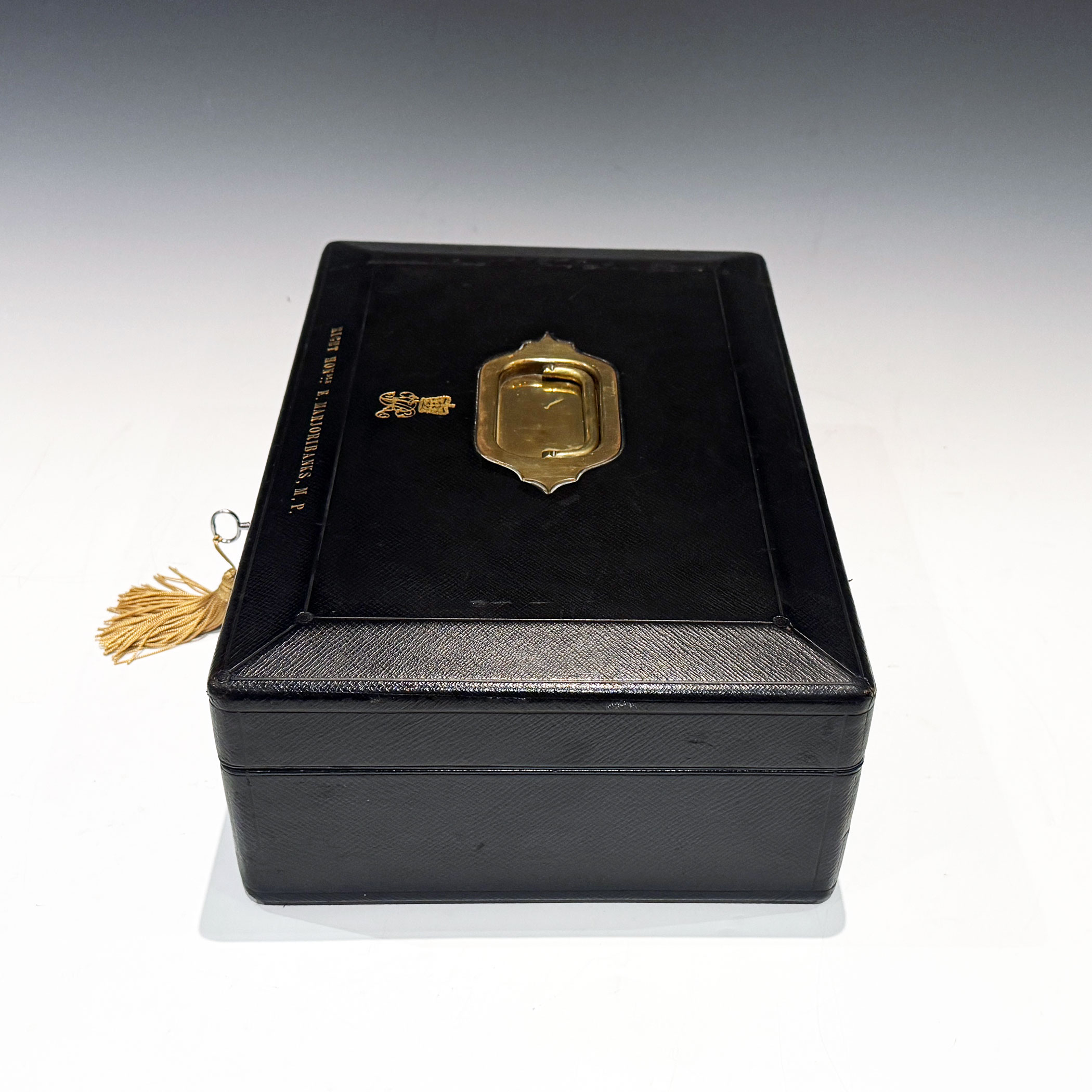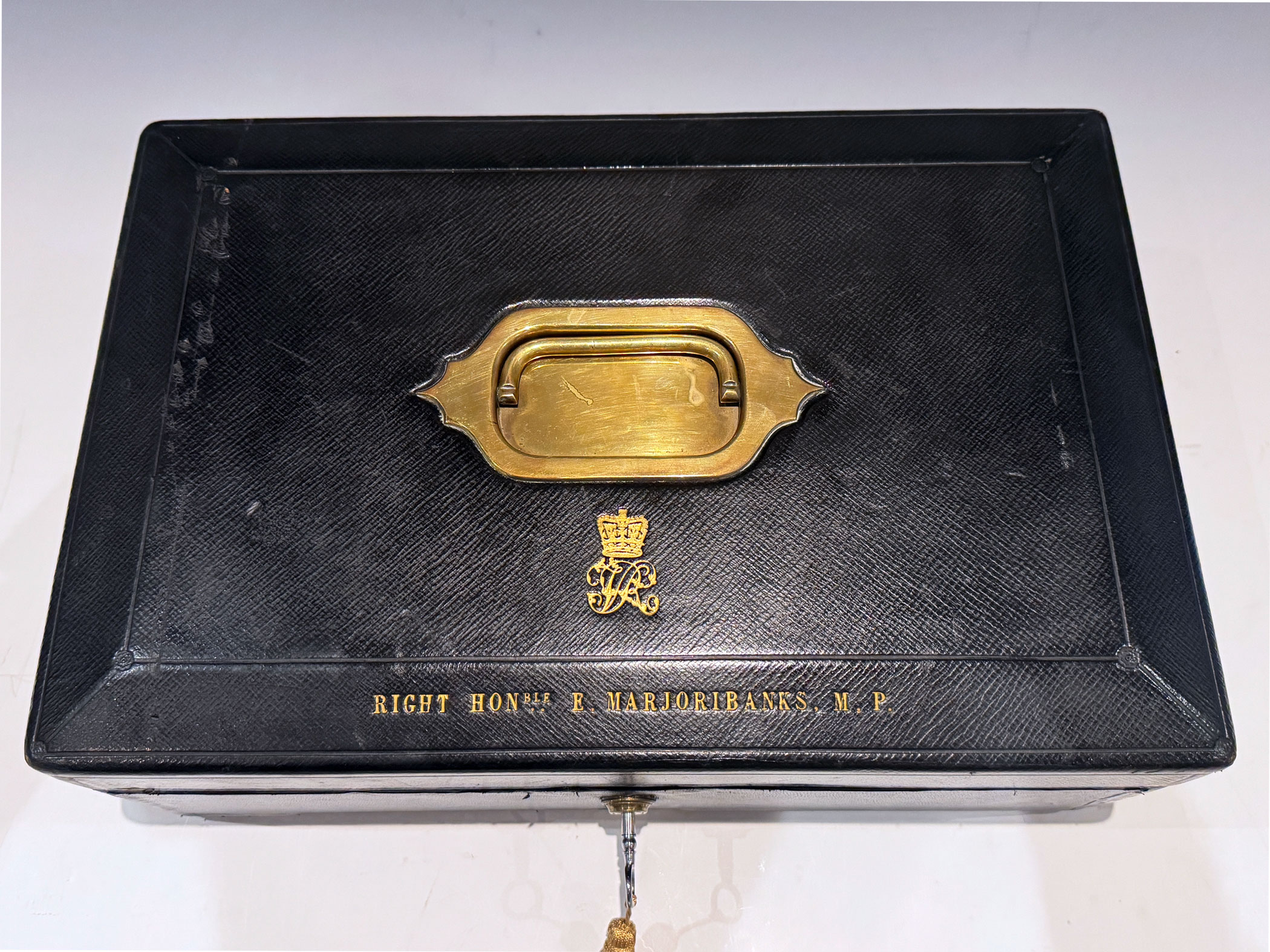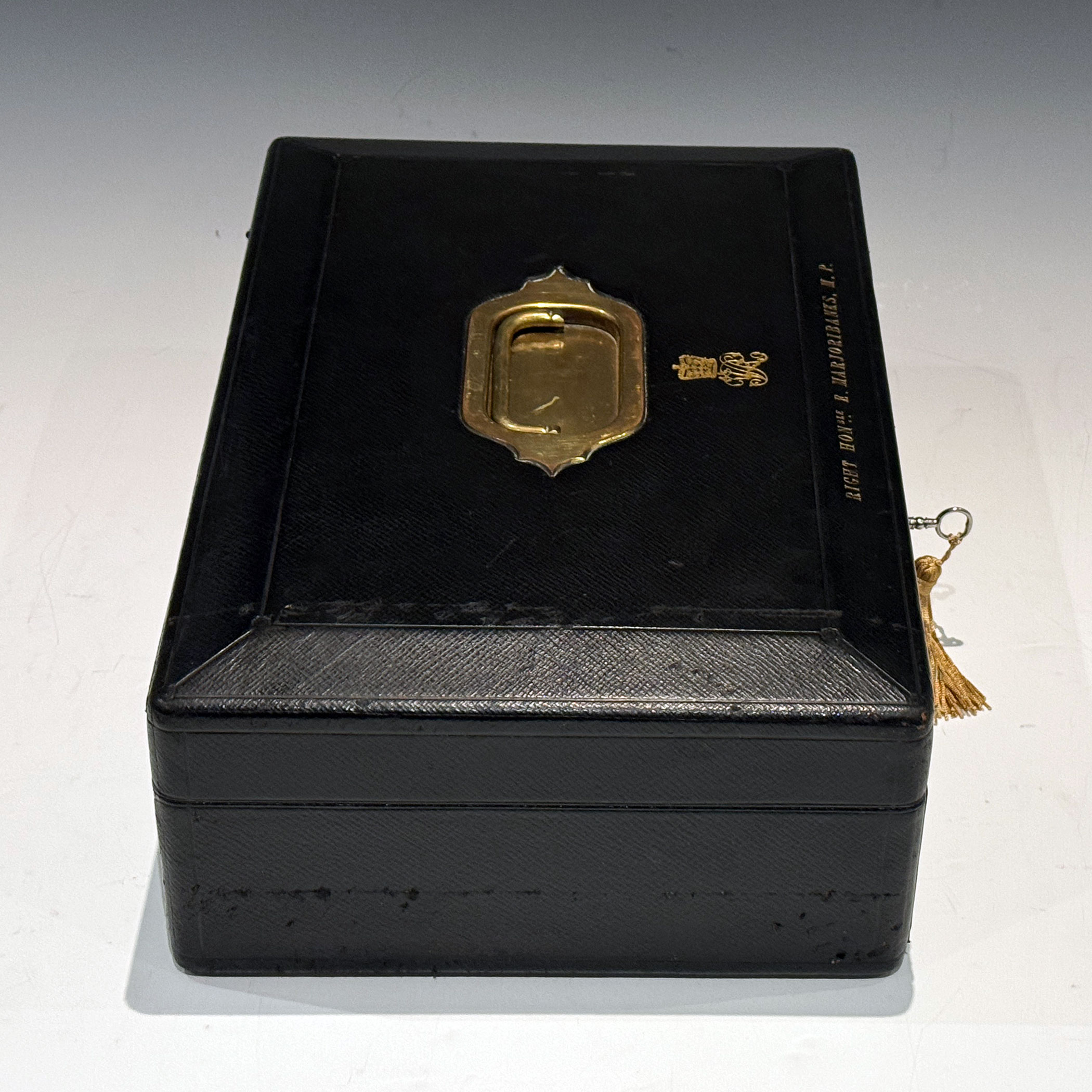 A well-proportioned Victorian Black Morocco Leather Clad Despatch Box the bevelled top, mounted, with a central recessed brass handle, is embossed with the royal cipher of Queen Victoria. The front bevel bears the name & title  'The RIGHT HON. E. MARJORIBANKS. M.P.'