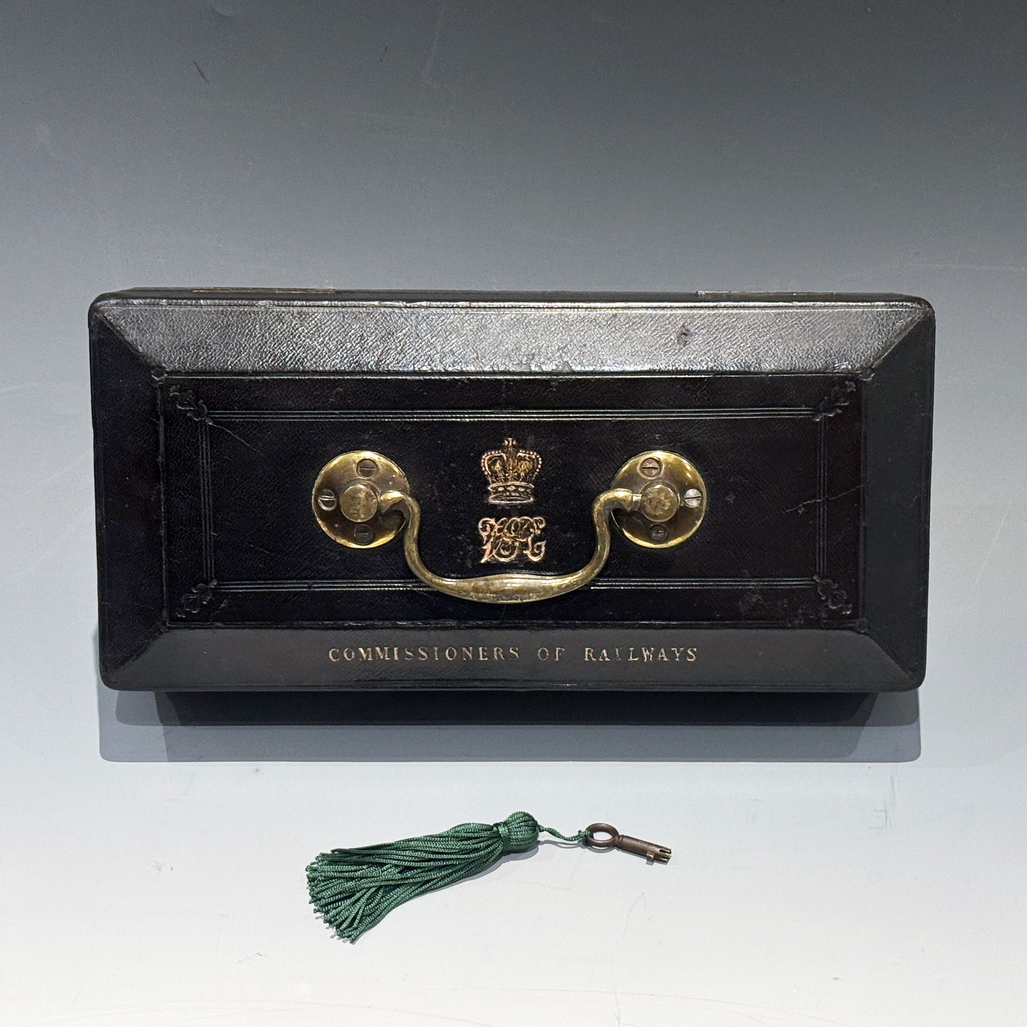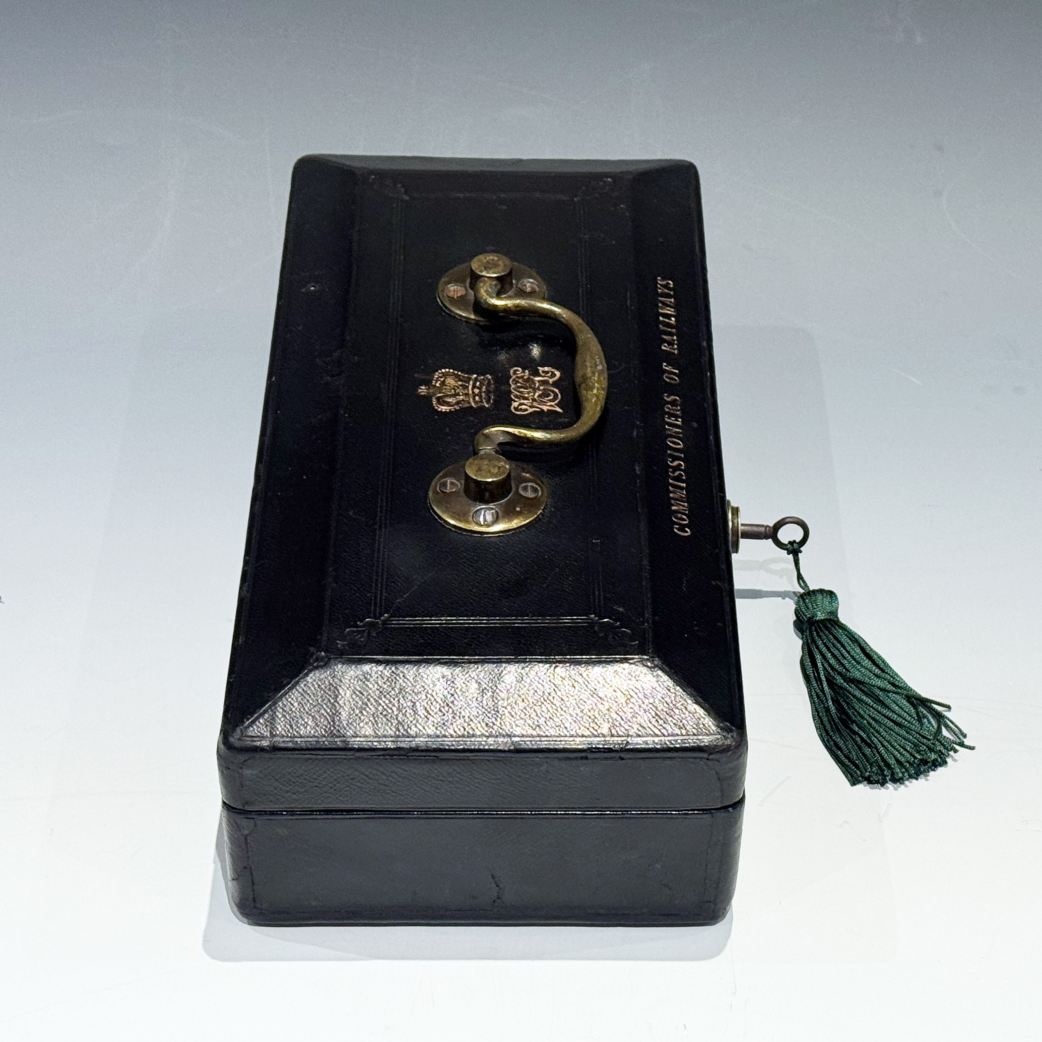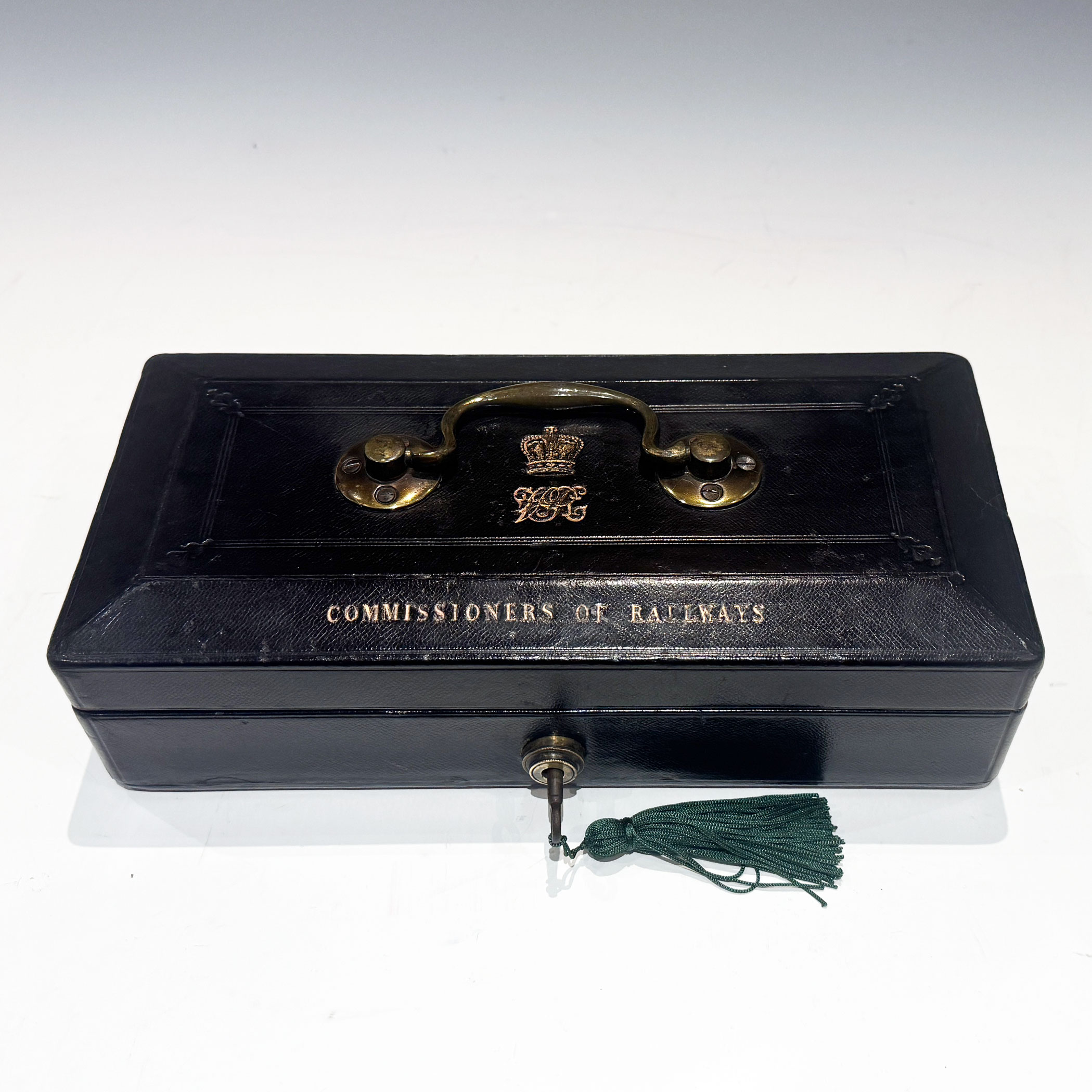 A Small and Extremely Rare Victorian Black Morocco Leather Despatch Box, just 29.5 cm long, the bevelled top bearing the royal insignia of Queen Victoria with a swing handle and 'COMMISSIONERS OF RAILWAYS'* in gilt lettering. The interior with raised sides retains its original green velvet lining. The Bramah Crown Patent lock is stamped S. MORDAN MAKERS, and has its original key.