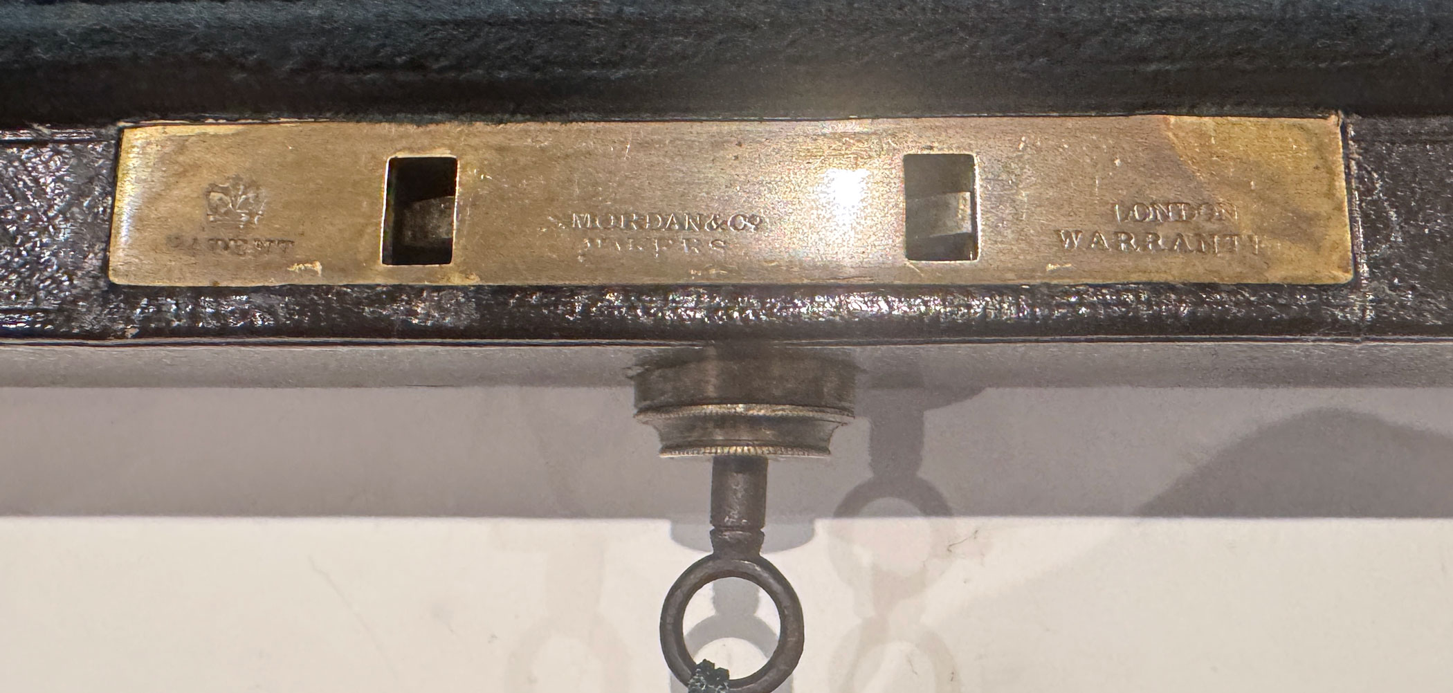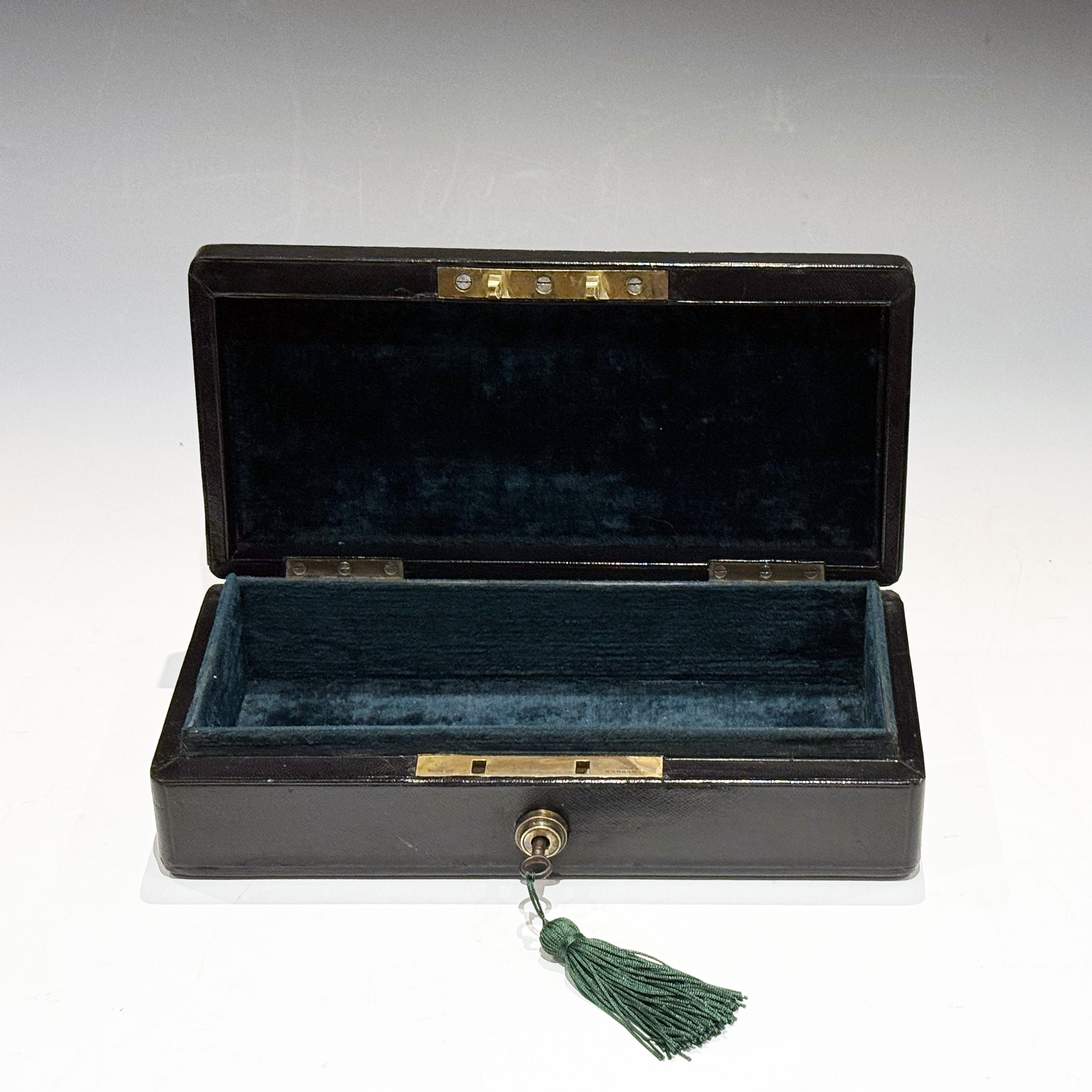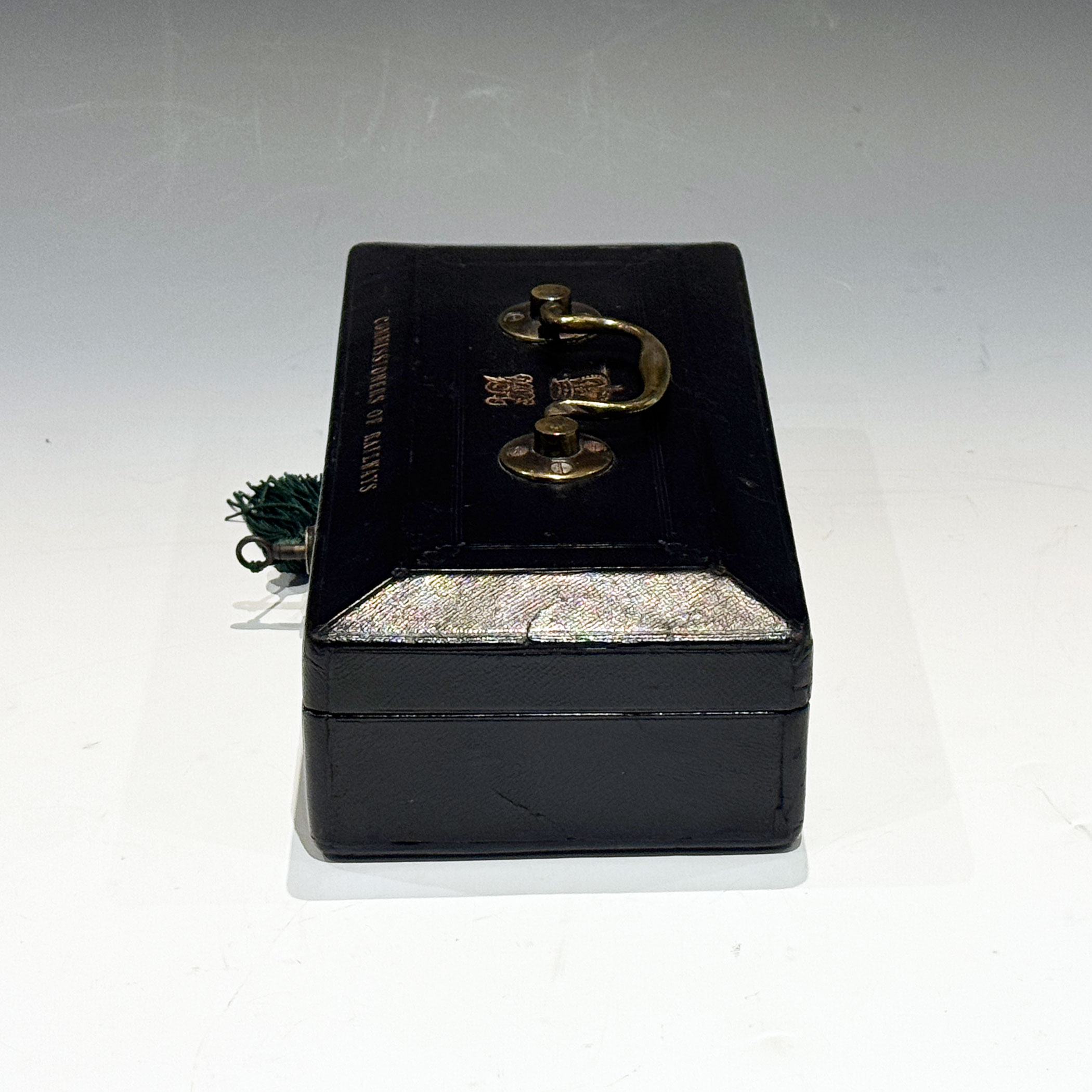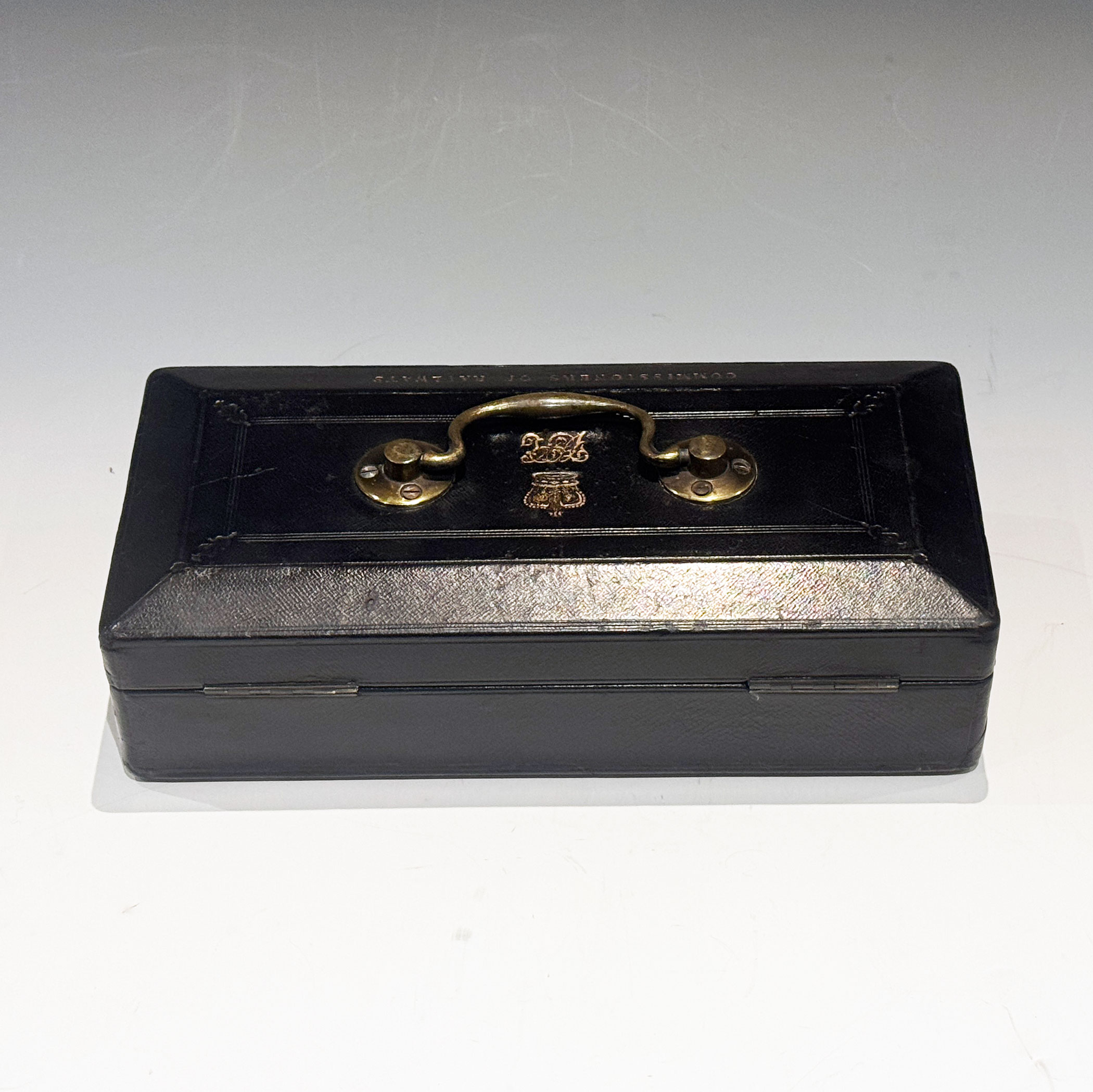 A Small and Extremely Rare Victorian Black Morocco Leather Despatch Box, just 29.5 cm long, the bevelled top bearing the royal insignia of Queen Victoria with a swing handle and 'COMMISSIONERS OF RAILWAYS'* in gilt lettering. The interior with raised sides retains its original green velvet lining. The Bramah Crown Patent lock is stamped S. MORDAN MAKERS, and has its original key.