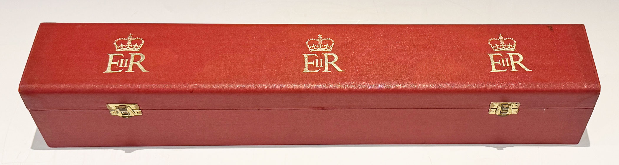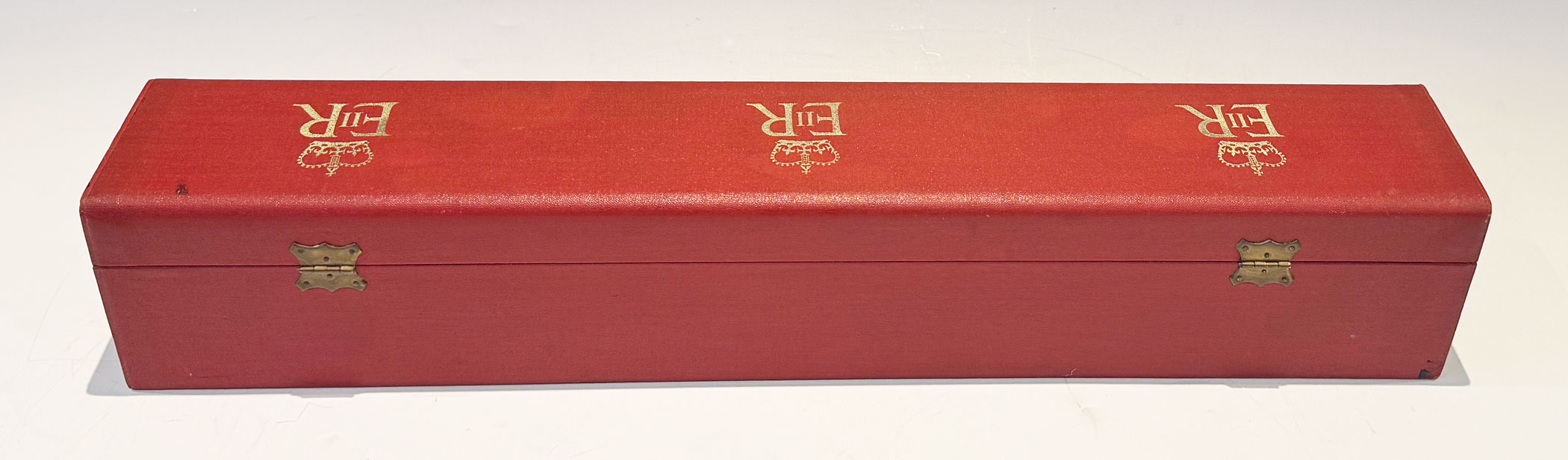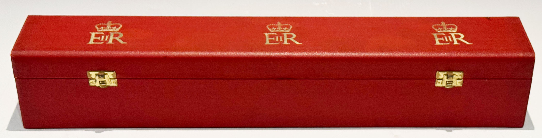 A Red Elizabeth II Investiture Scroll Box embossed EIIR in three locations across the top, with a pair of brass latches securing the red canvas lined interior.