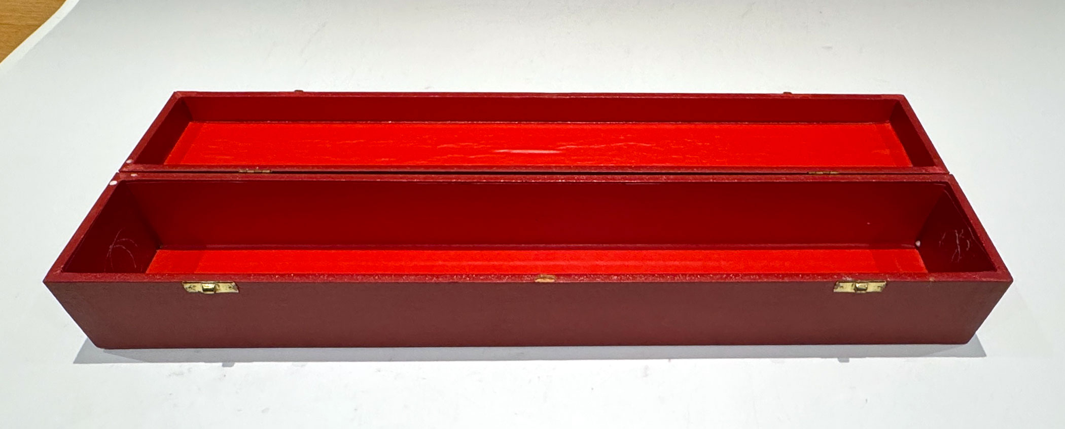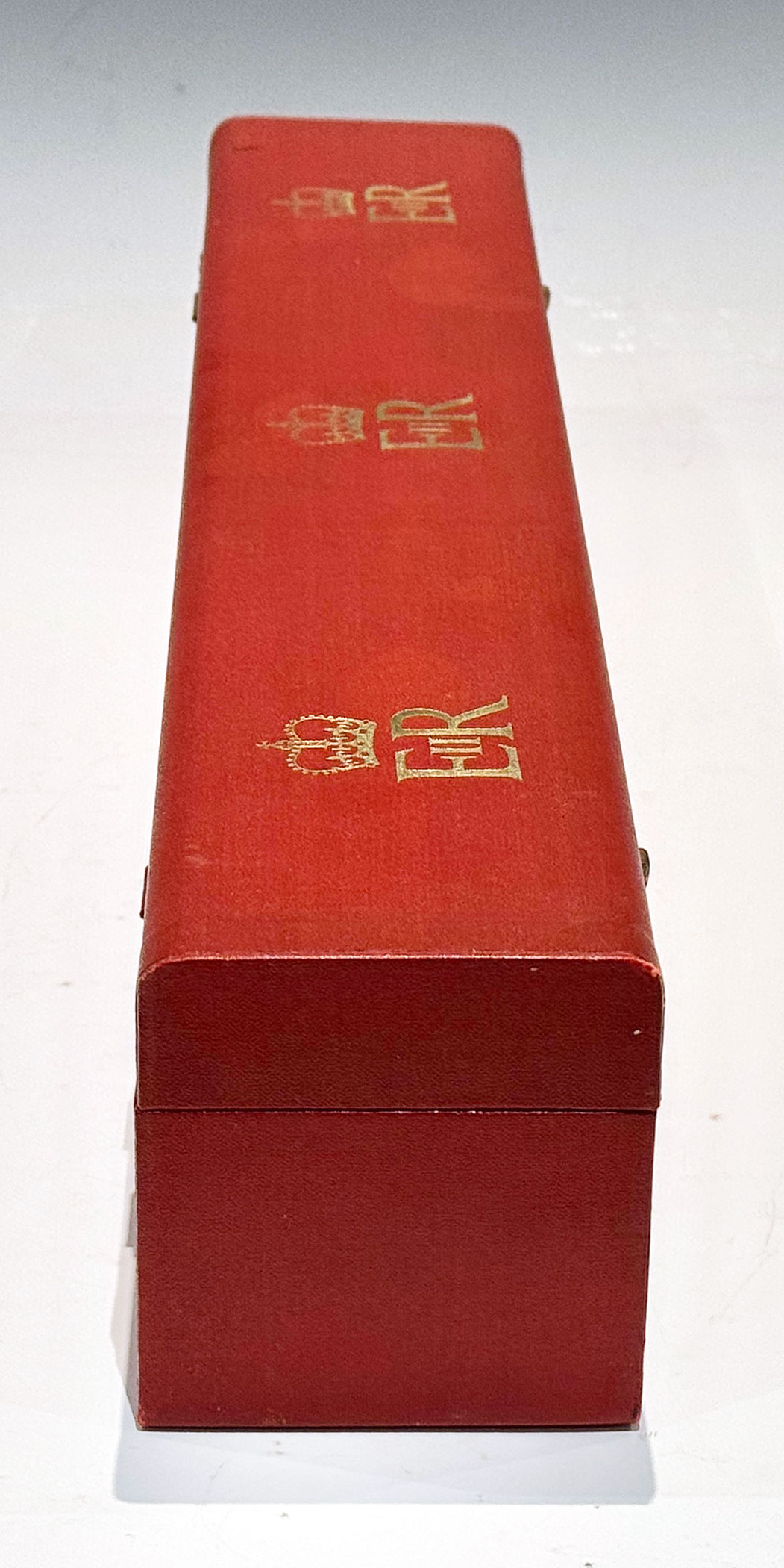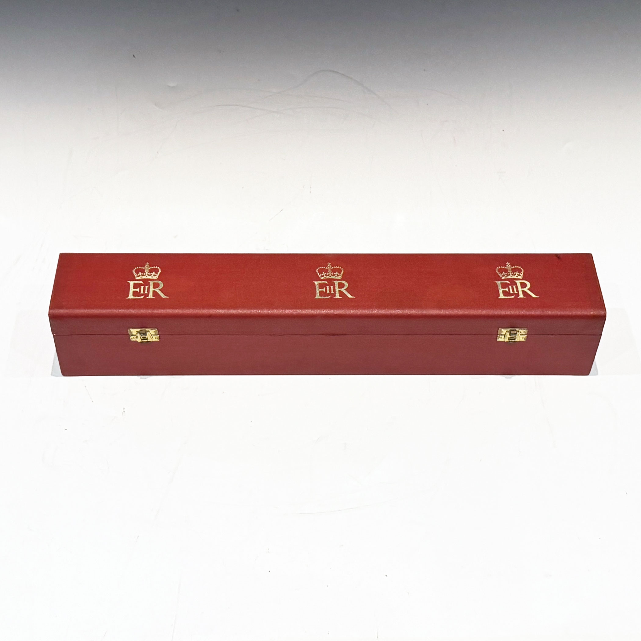 A Red Elizabeth II Investiture Scroll Box embossed EIIR in three locations across the top, with a pair of brass latches securing the red canvas lined interior.