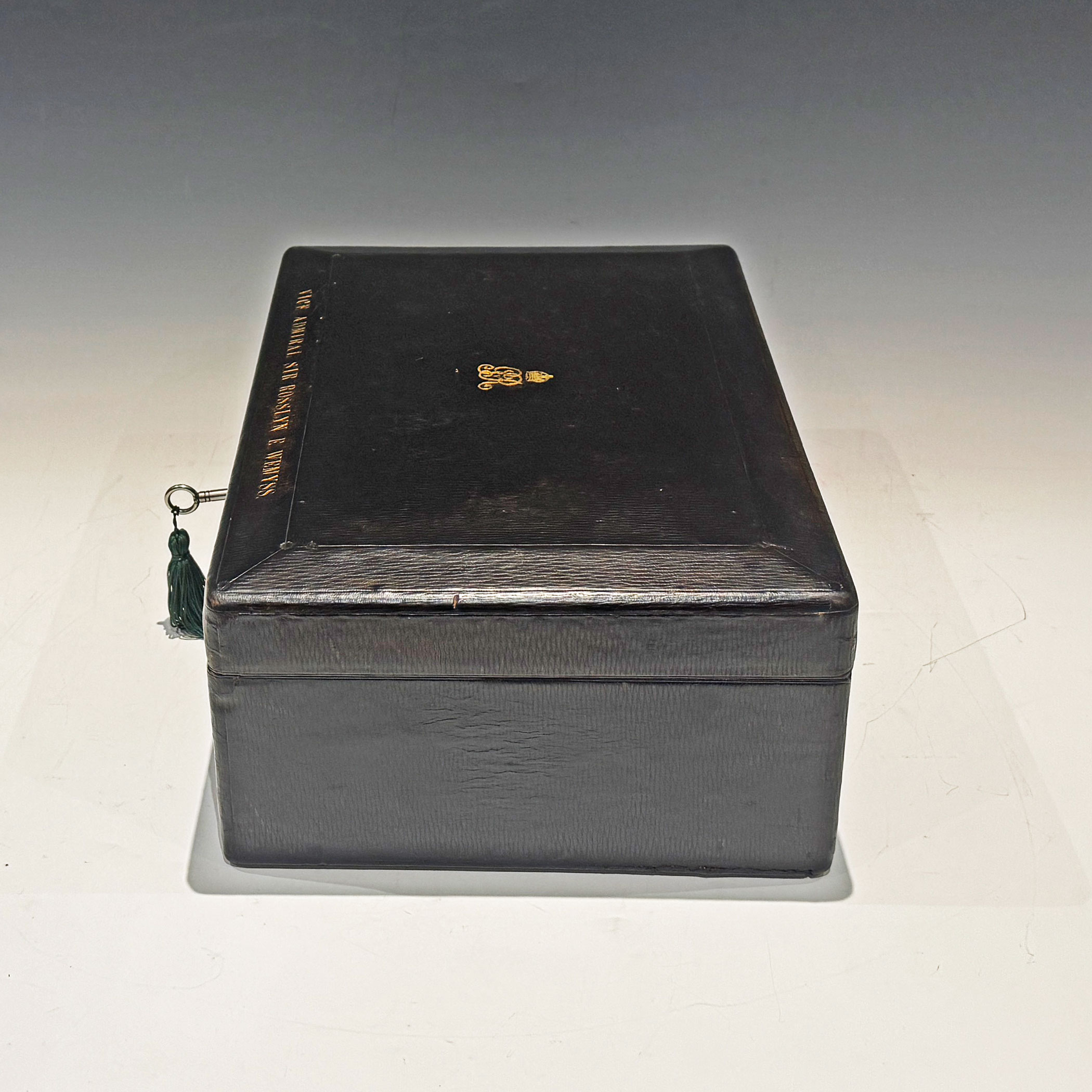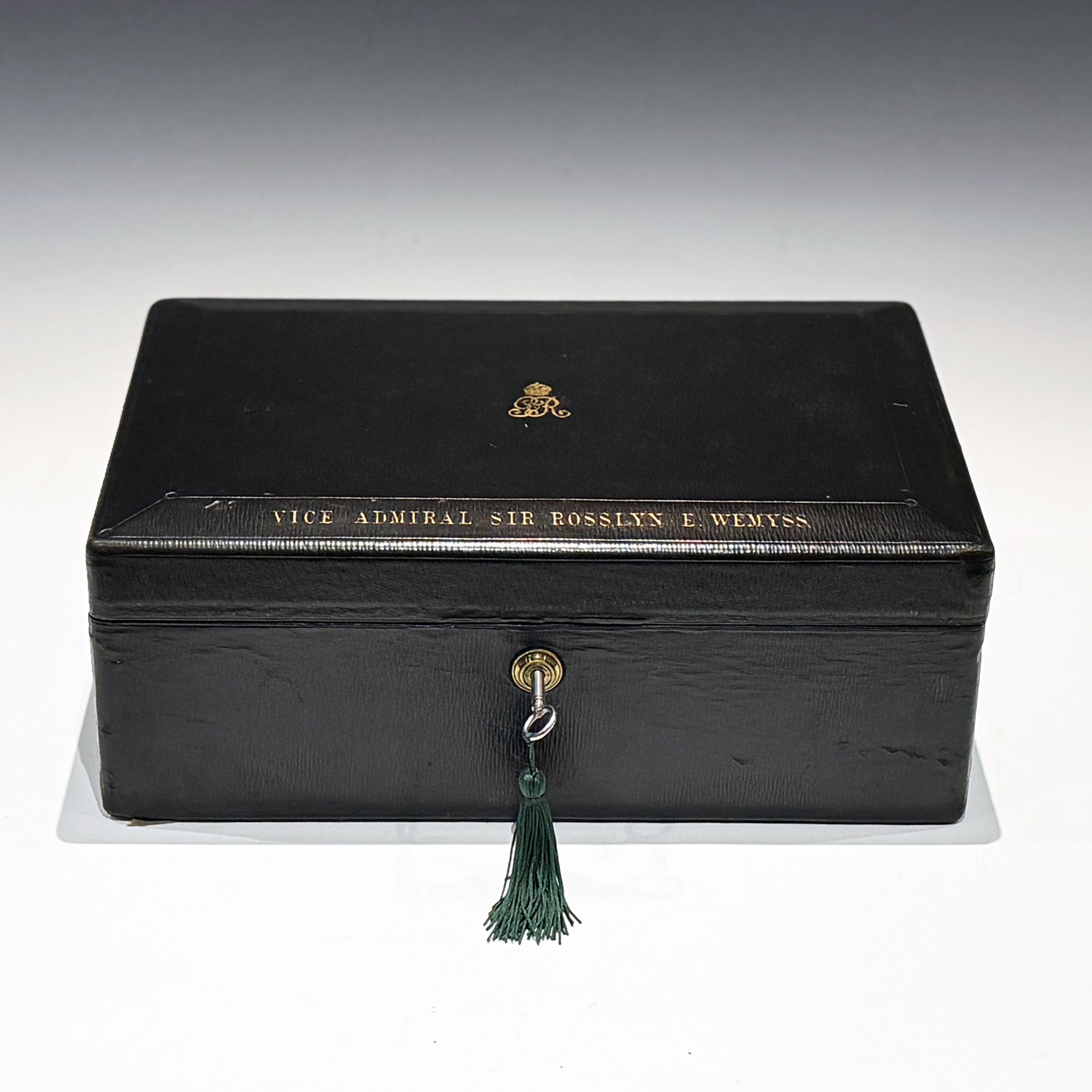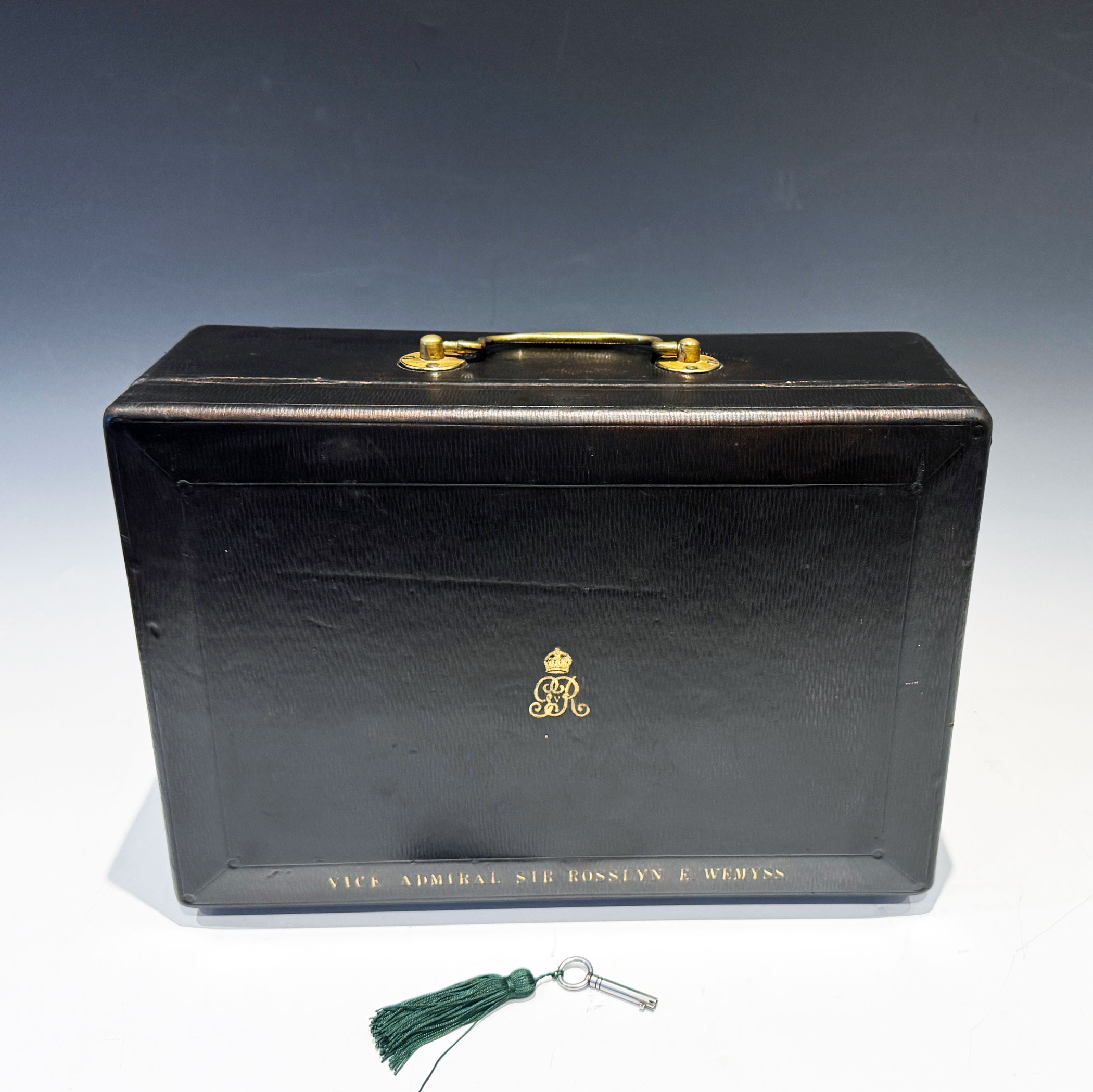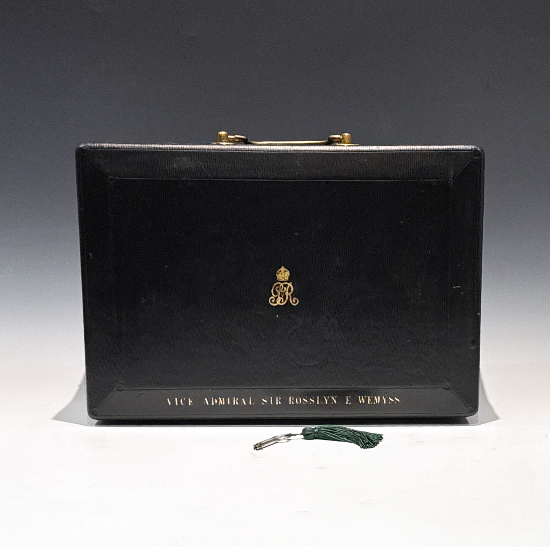 A George V Black Morocco Leather Despatch Box with rear handle and Bramah Patent lock, the forward bevel embossed 'Vice Admiral S Rosslyn E Wemyss', the black leather lined interior with raised sides and security studs.