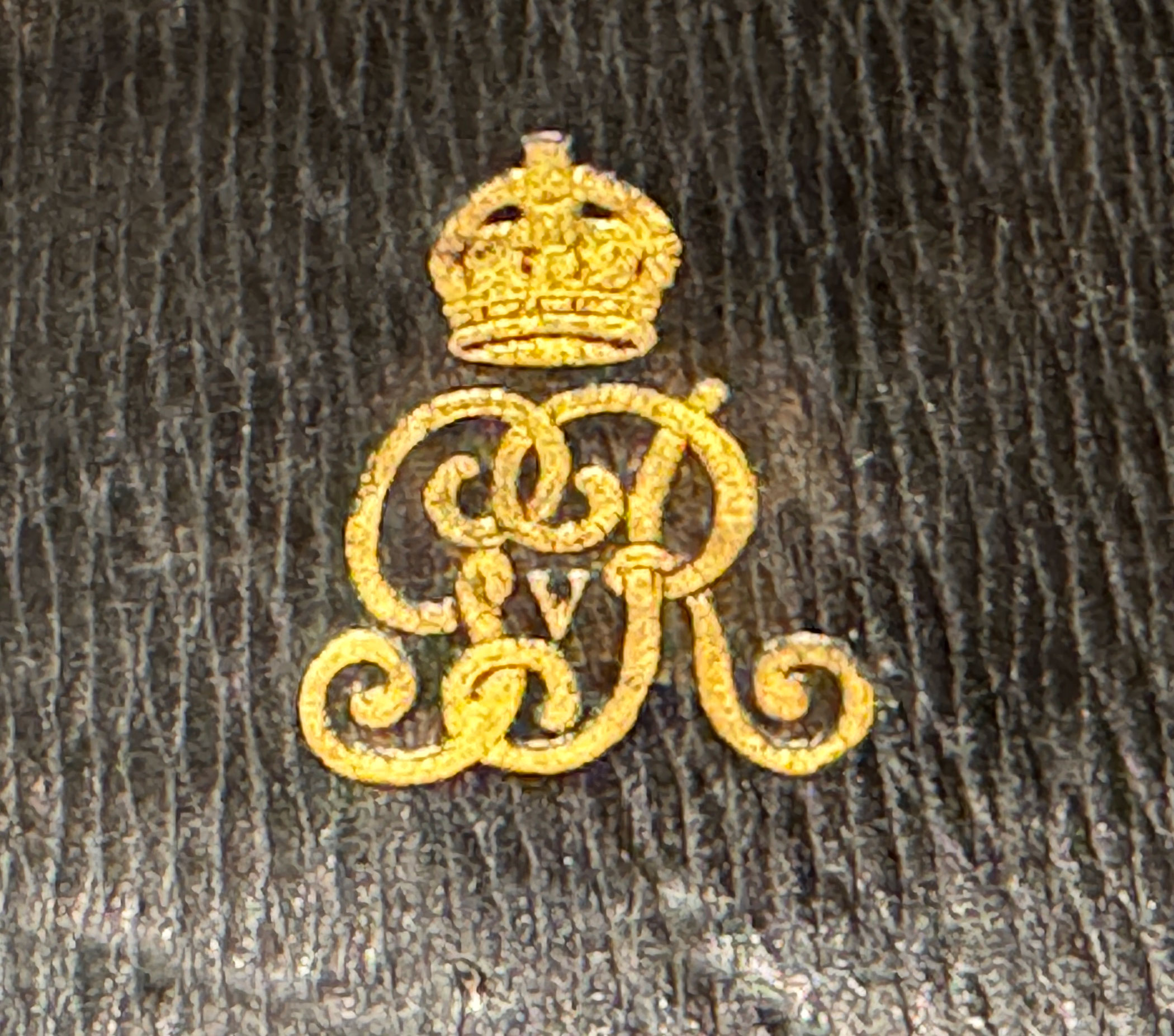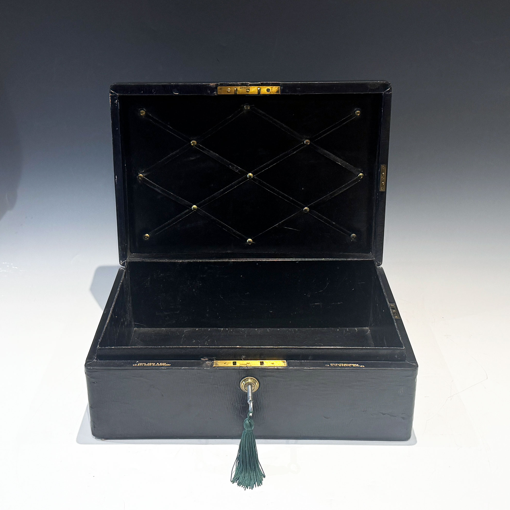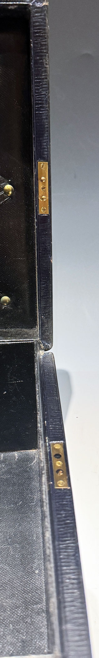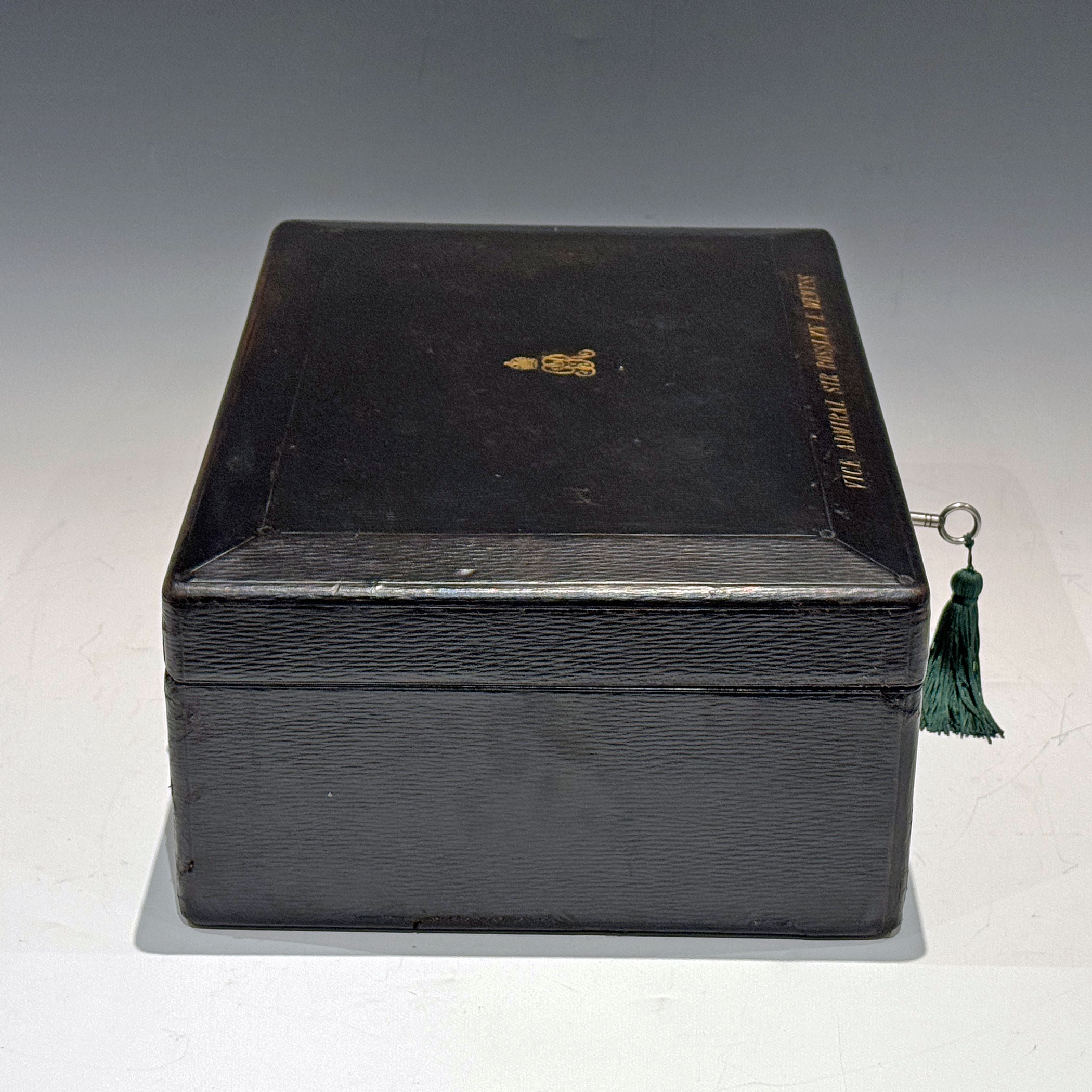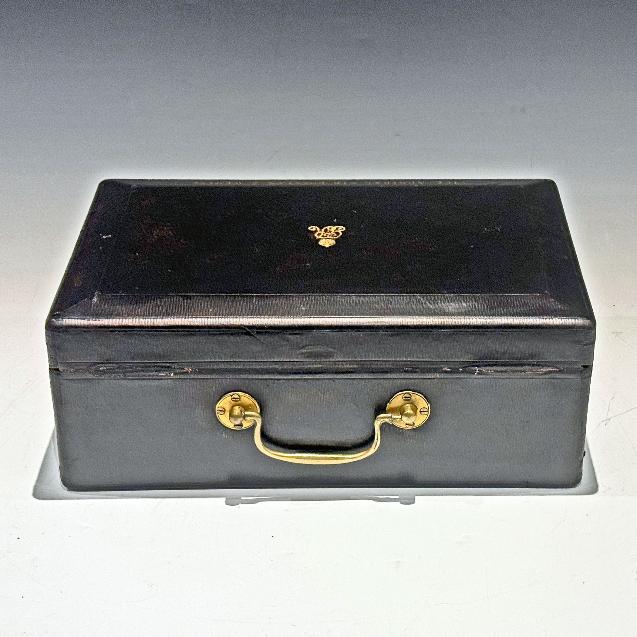 A George V Black Morocco Leather Despatch Box with rear handle and Bramah Patent lock, the forward bevel embossed 'Vice Admiral S Rosslyn E Wemyss', the black leather lined interior with raised sides and security studs.