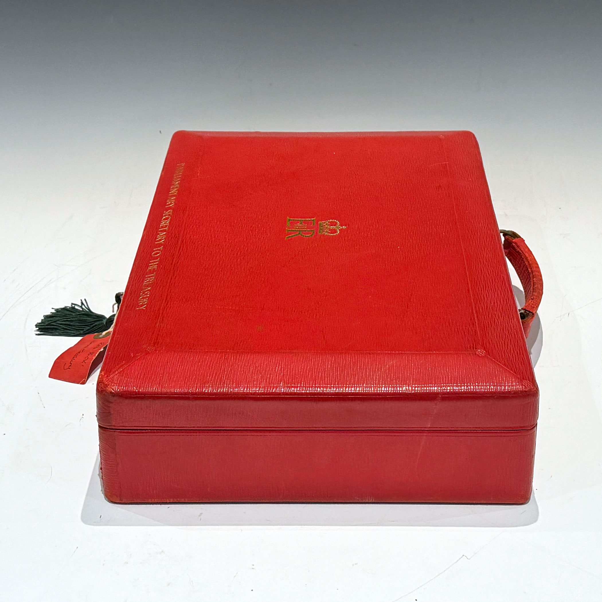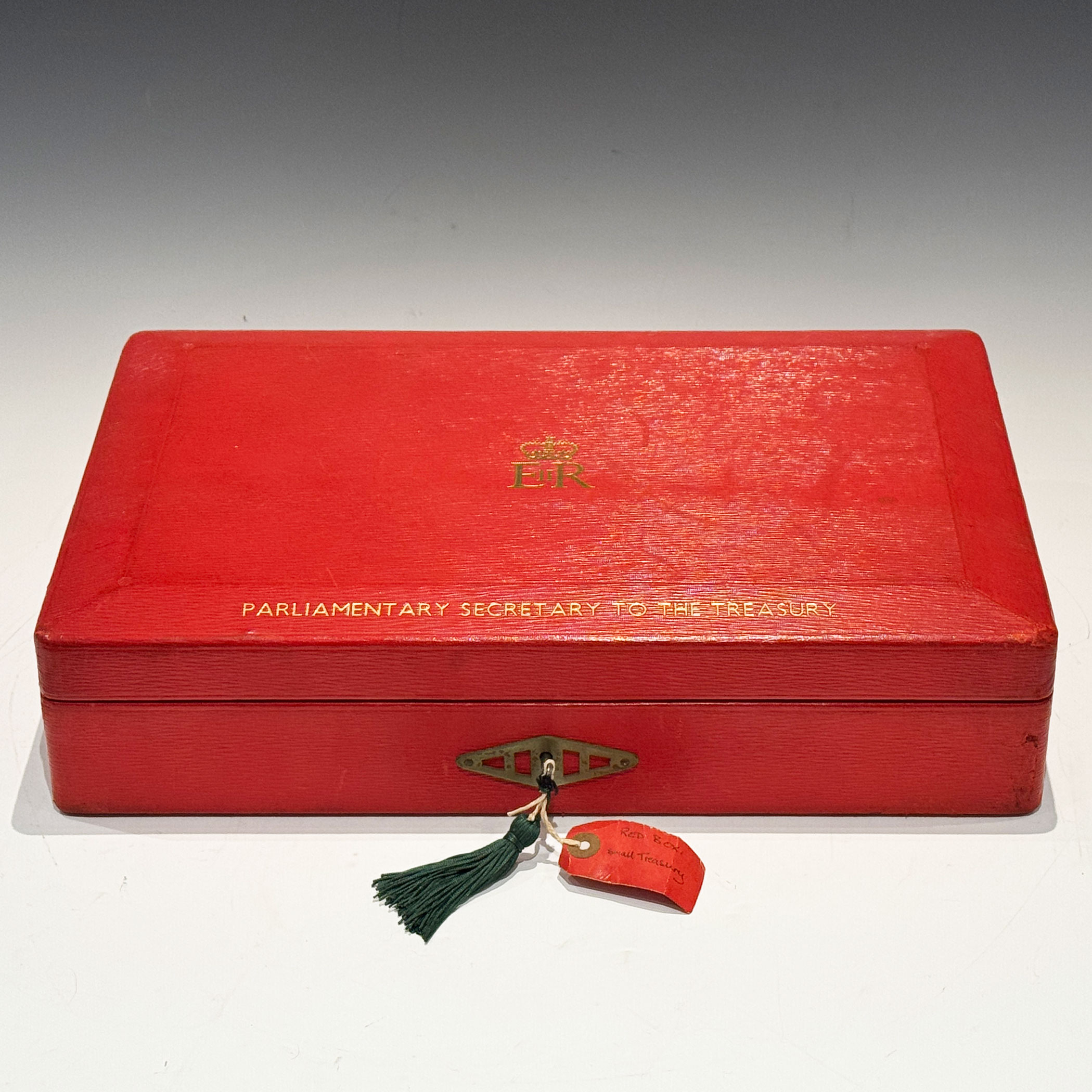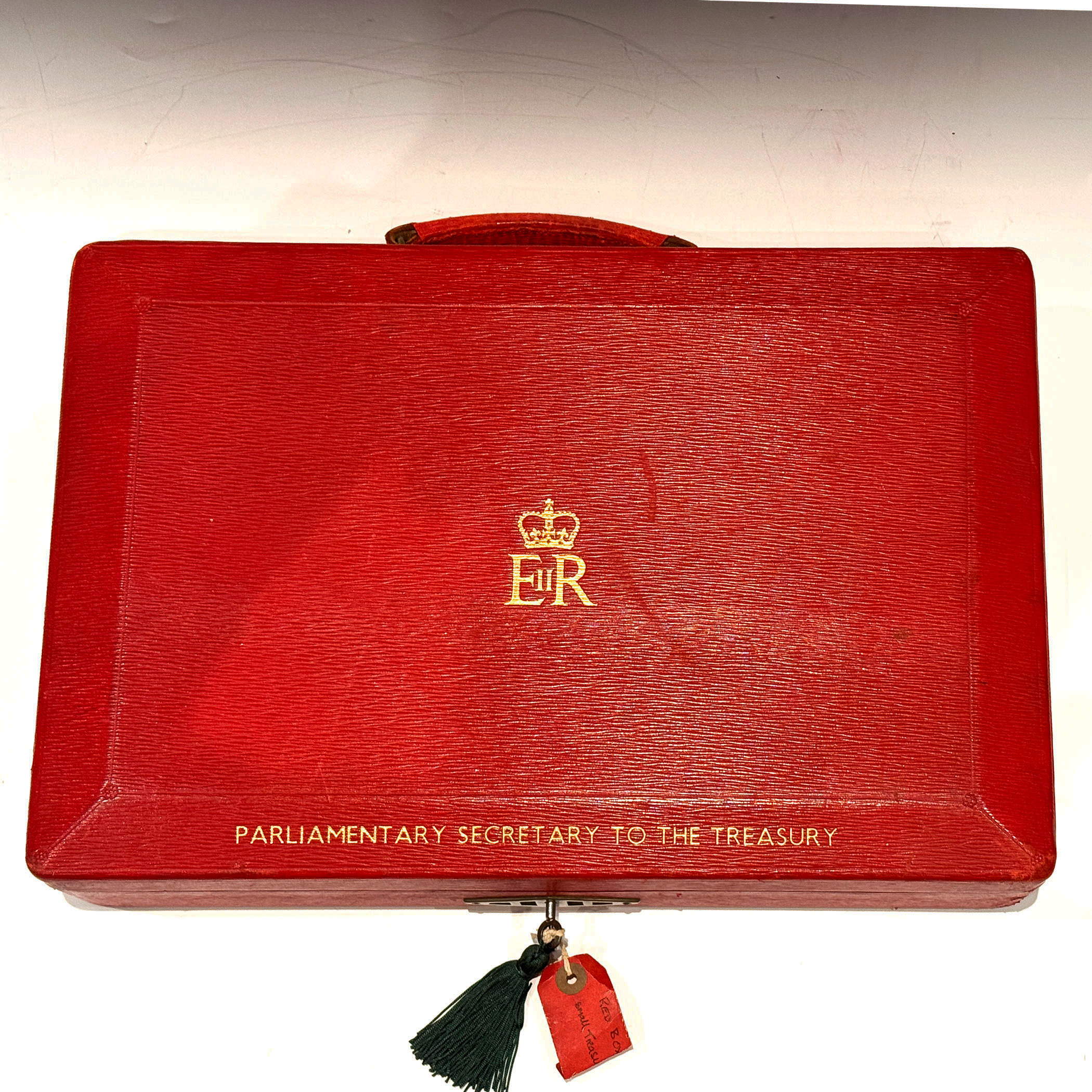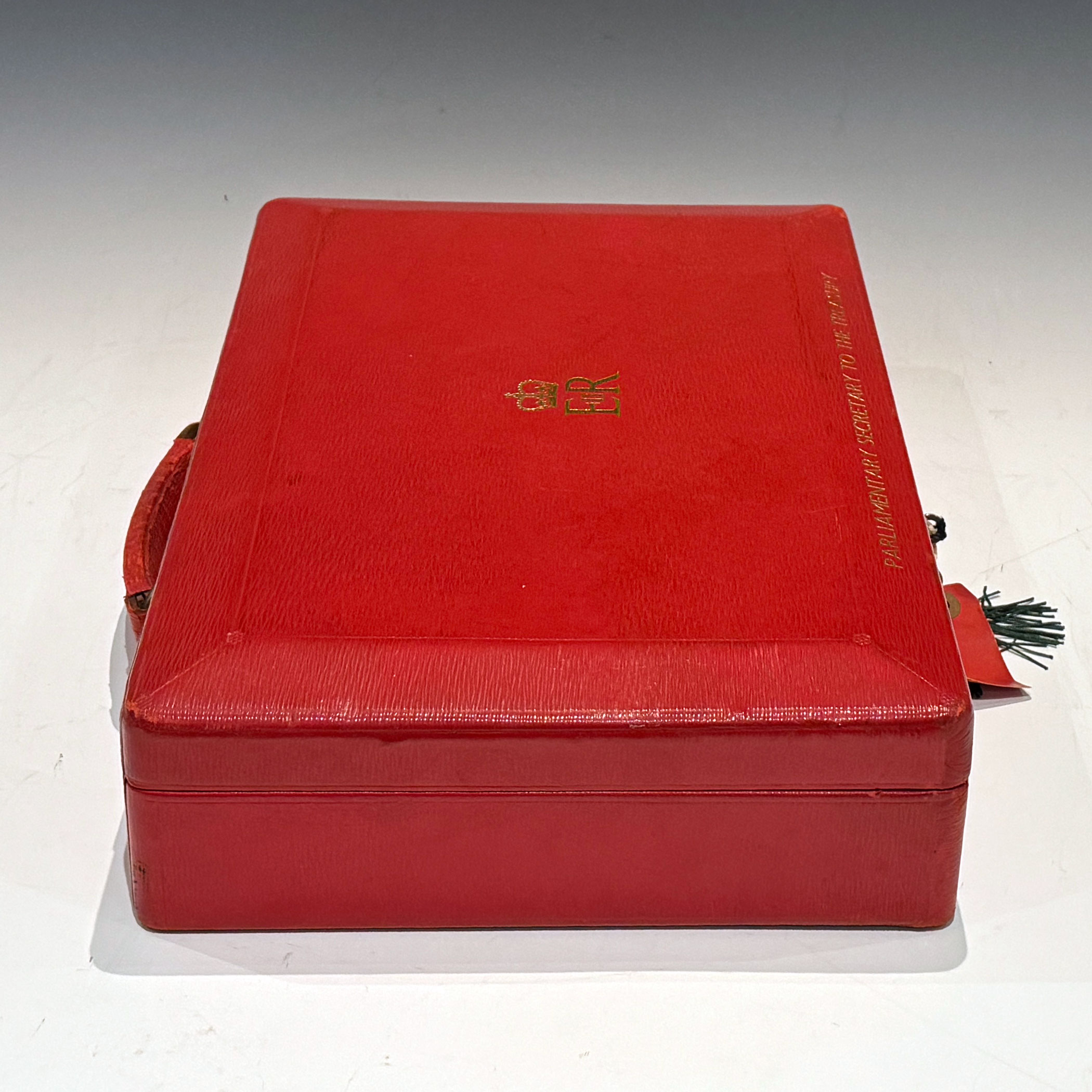 A Red QEII Leather Despatch Box, the bevelled top embossed with the royal cypher of Queen Elizabeth II and inscribed ‘Parliamentary Secretary to to the Treasury’ *The briefcase type leather handle is at the rear of the box for comfortable travelling. The 5 lever Chubb lock & key are stamped Chubb and have 5 levers.