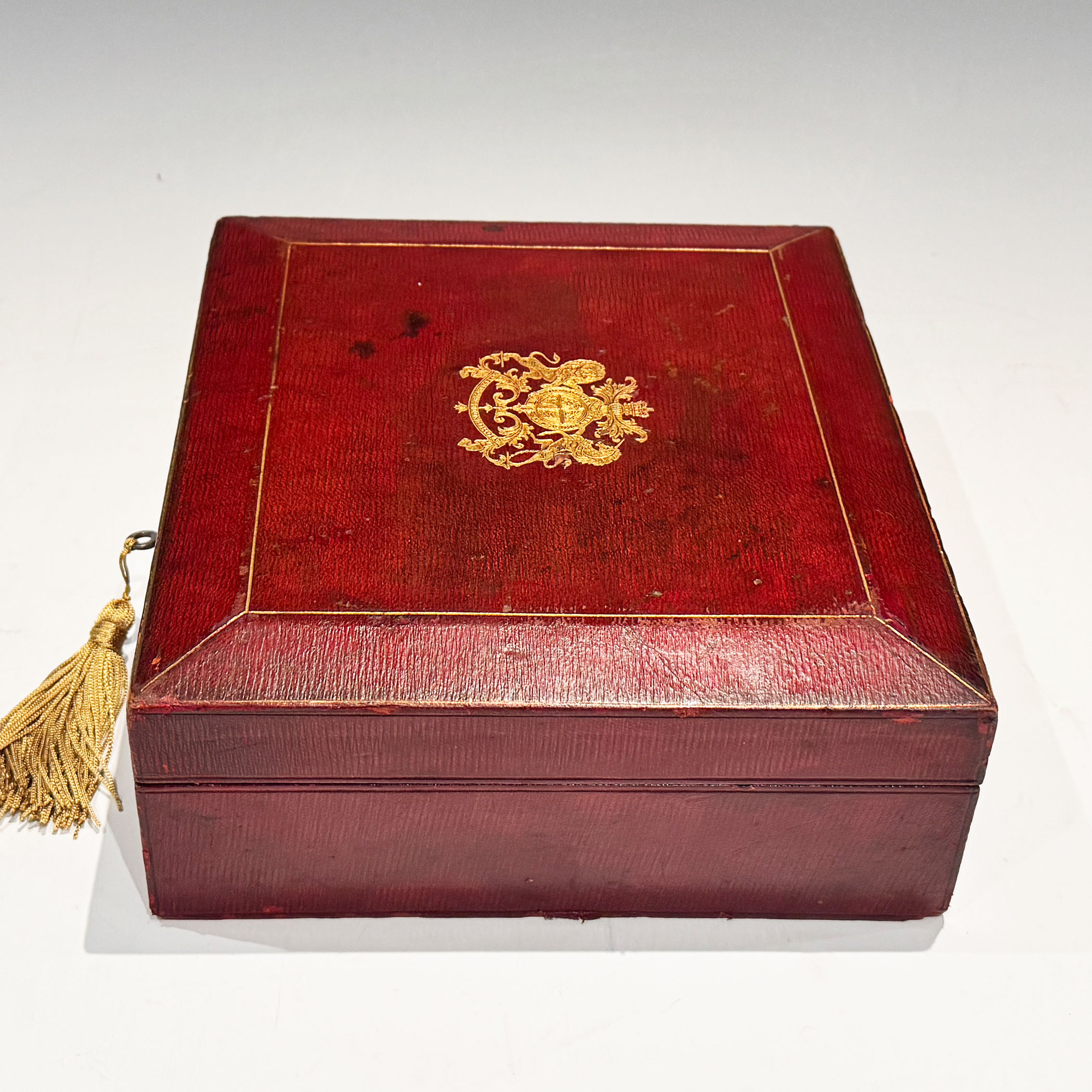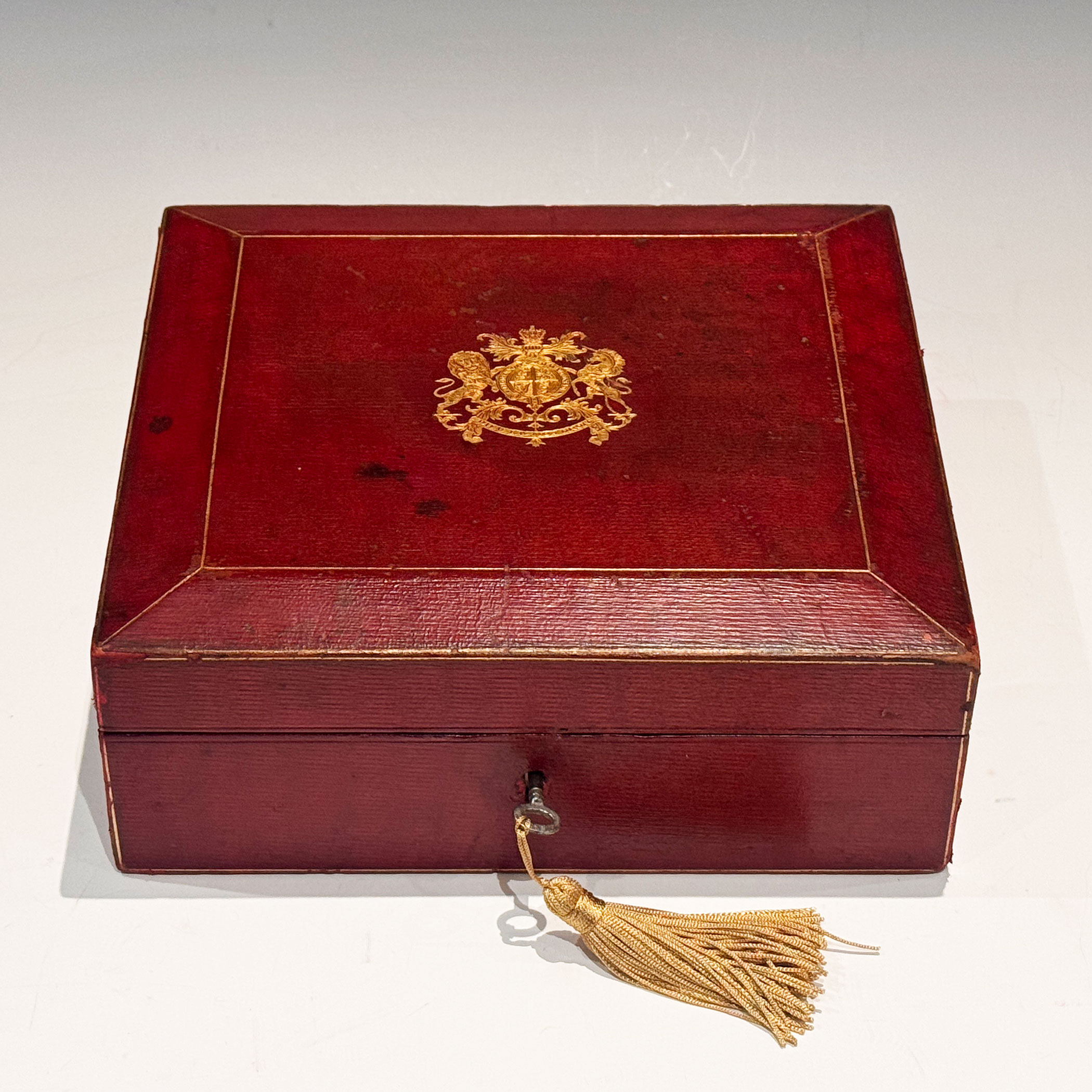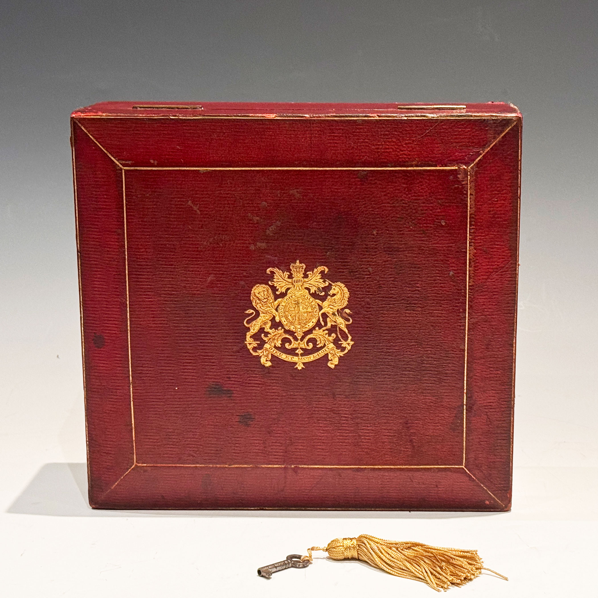 An Early 20th Century Red Leather clad investiture Box, the bevelled top gilt embossed with the English Royal Coat of Arms, the interior with raised sides is lined with the original plum velvet. The lock retains its original key.