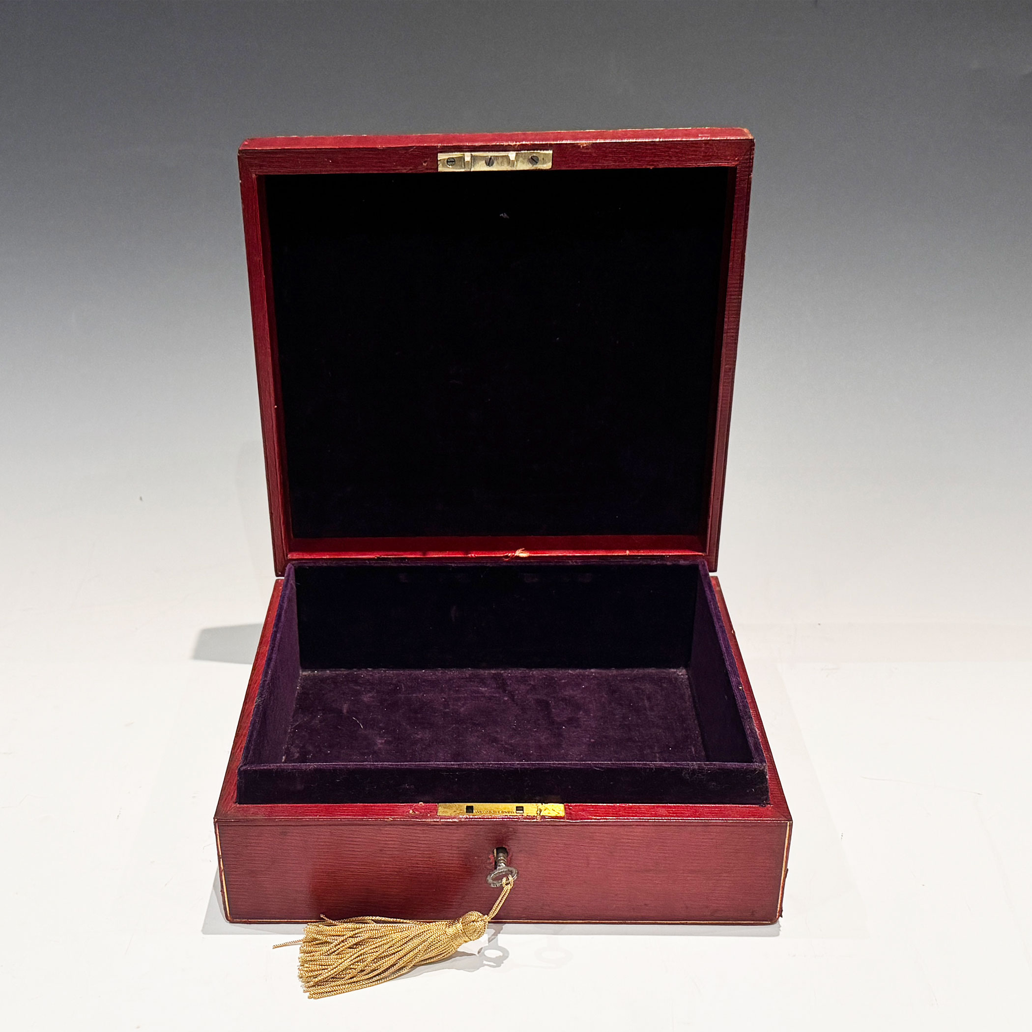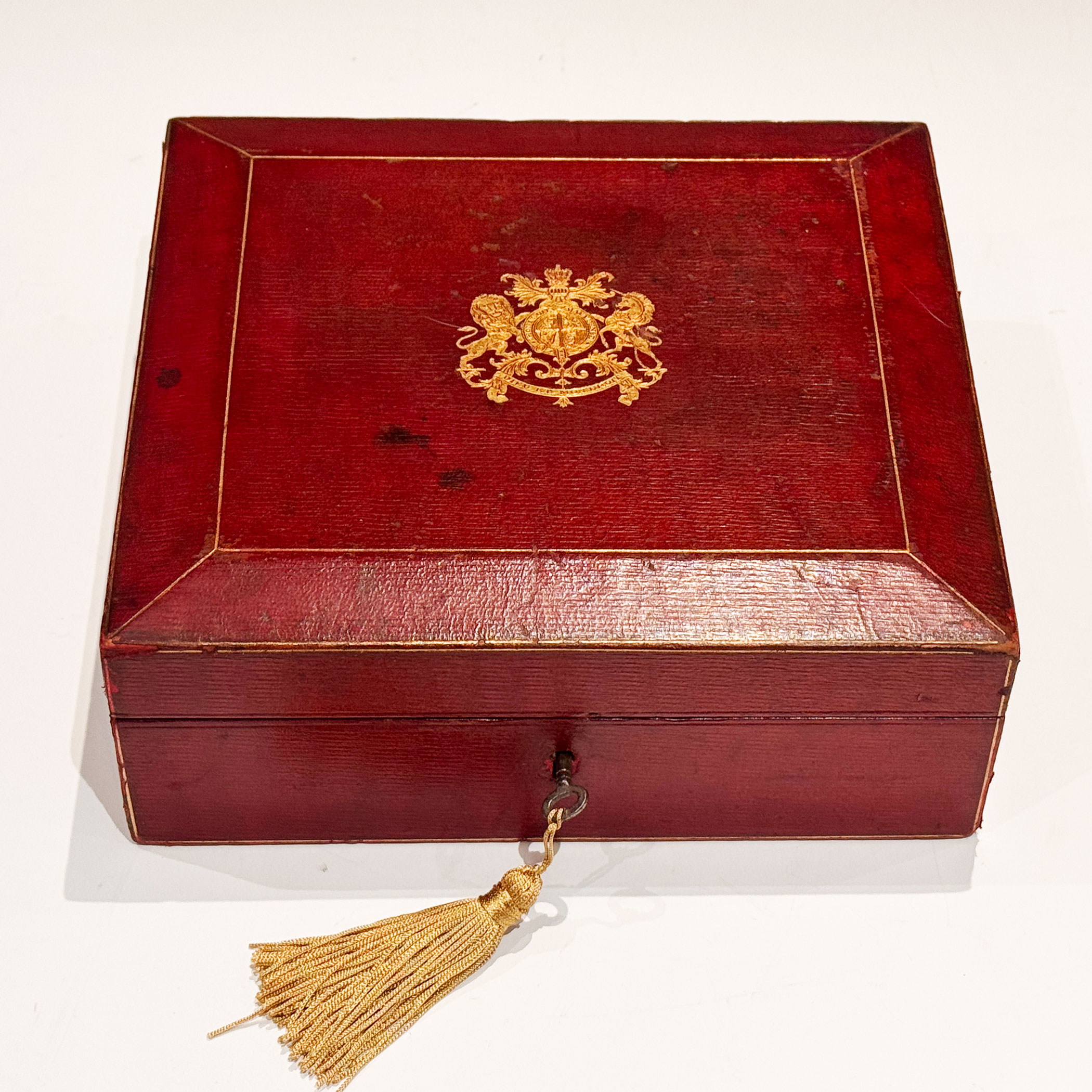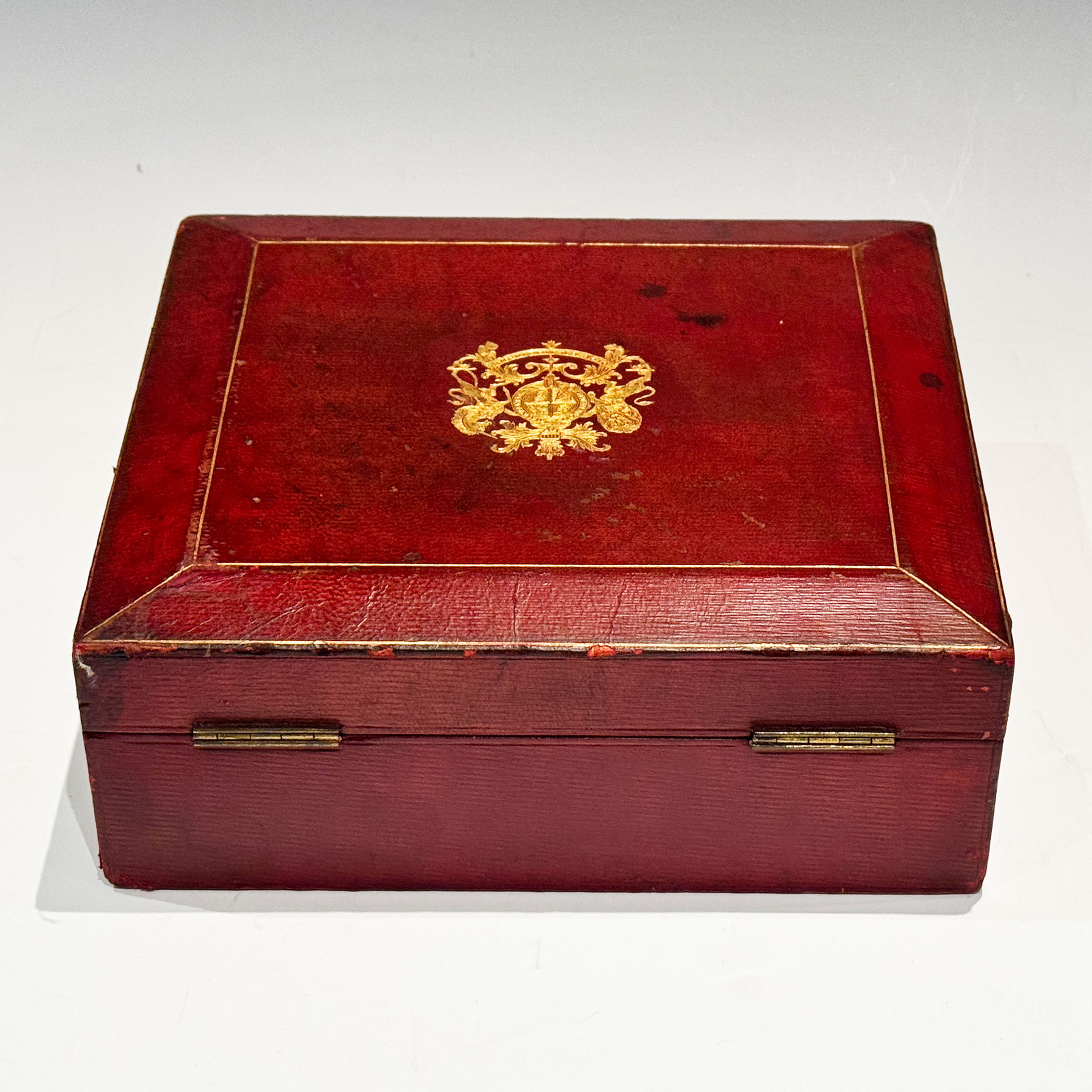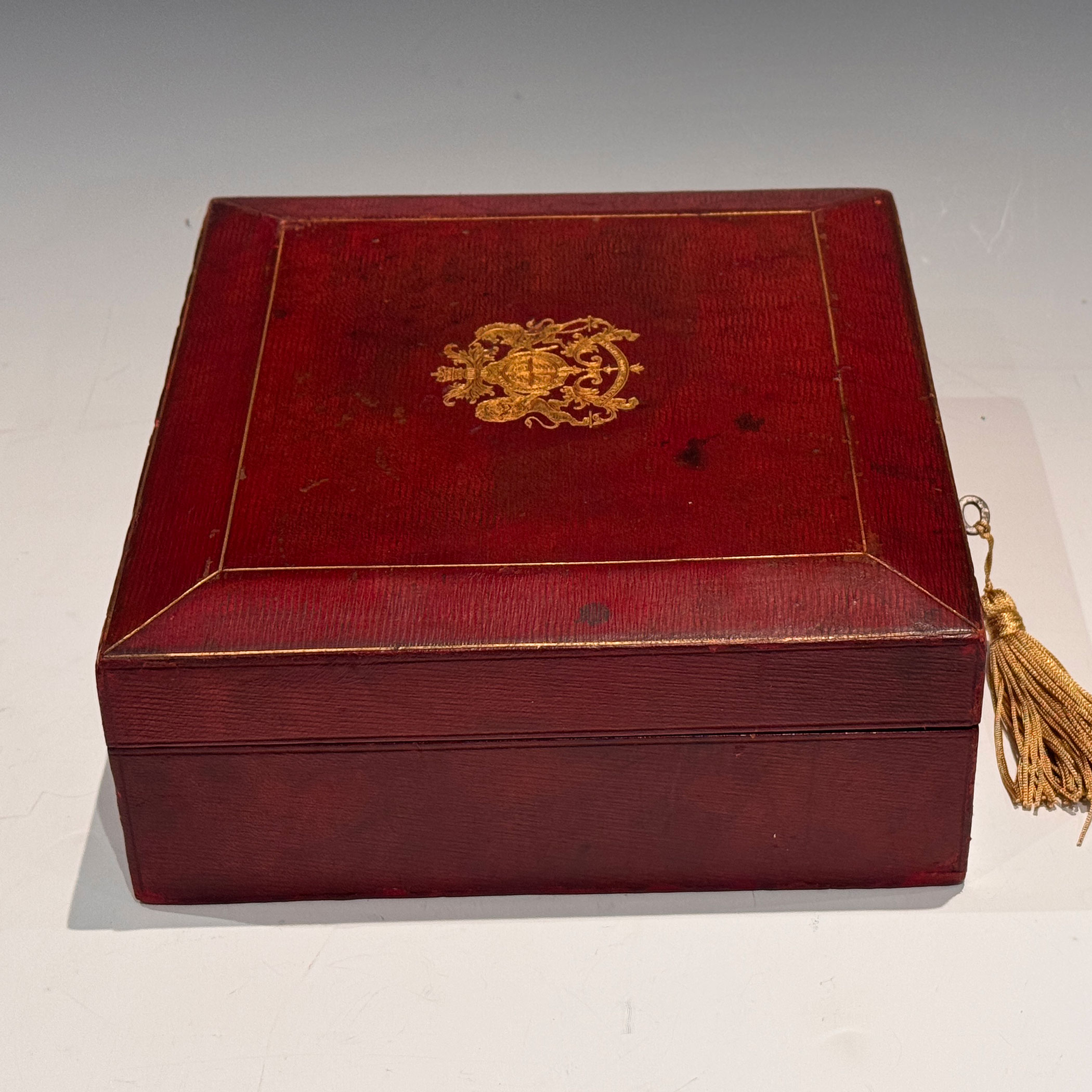 An Early 20th Century Red Leather clad investiture Box, the bevelled top gilt embossed with the English Royal Coat of Arms, the interior with raised sides is lined with the original plum velvet. The lock retains its original key.