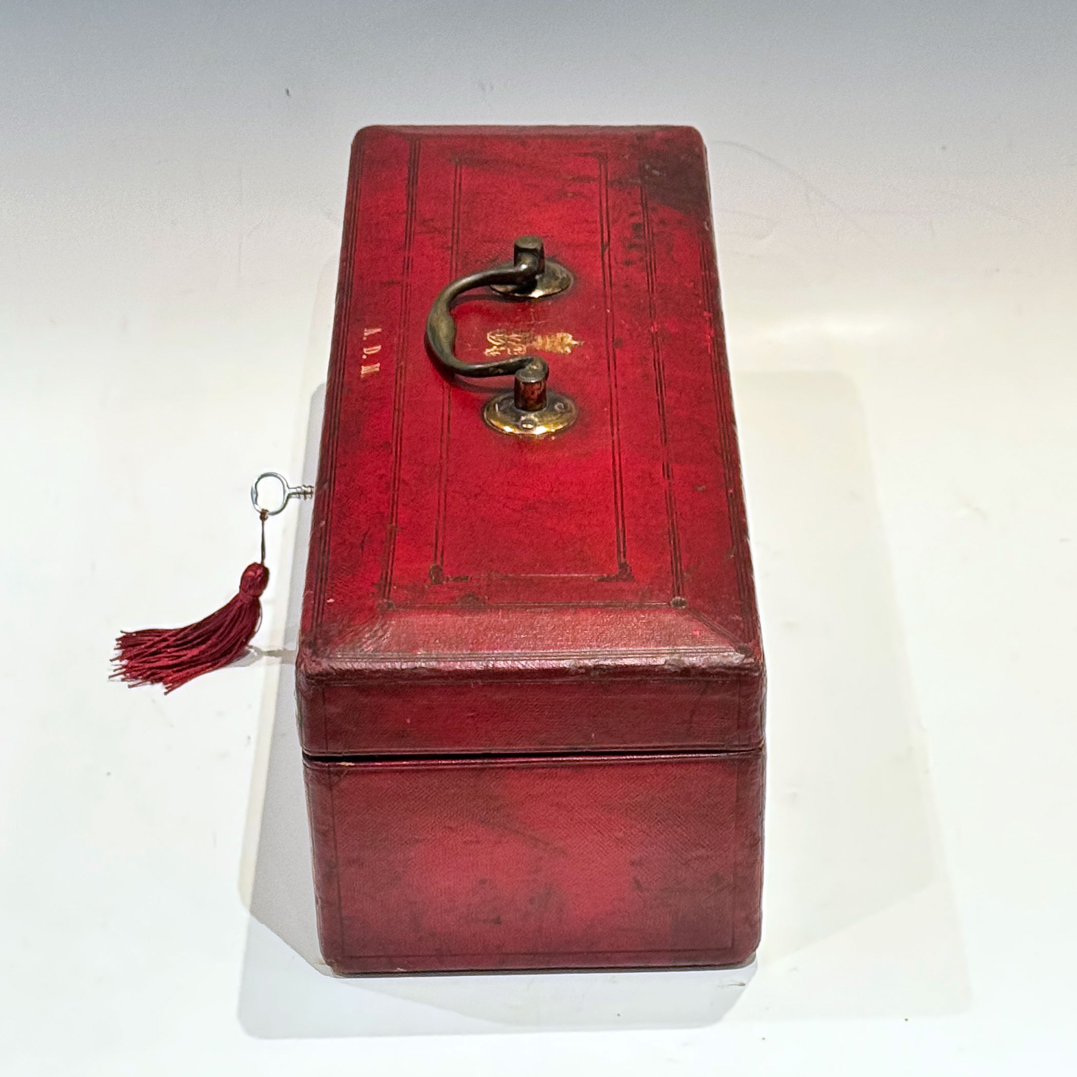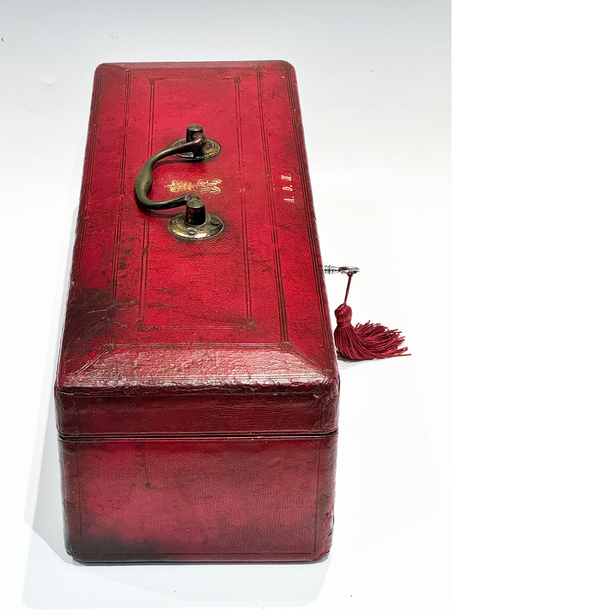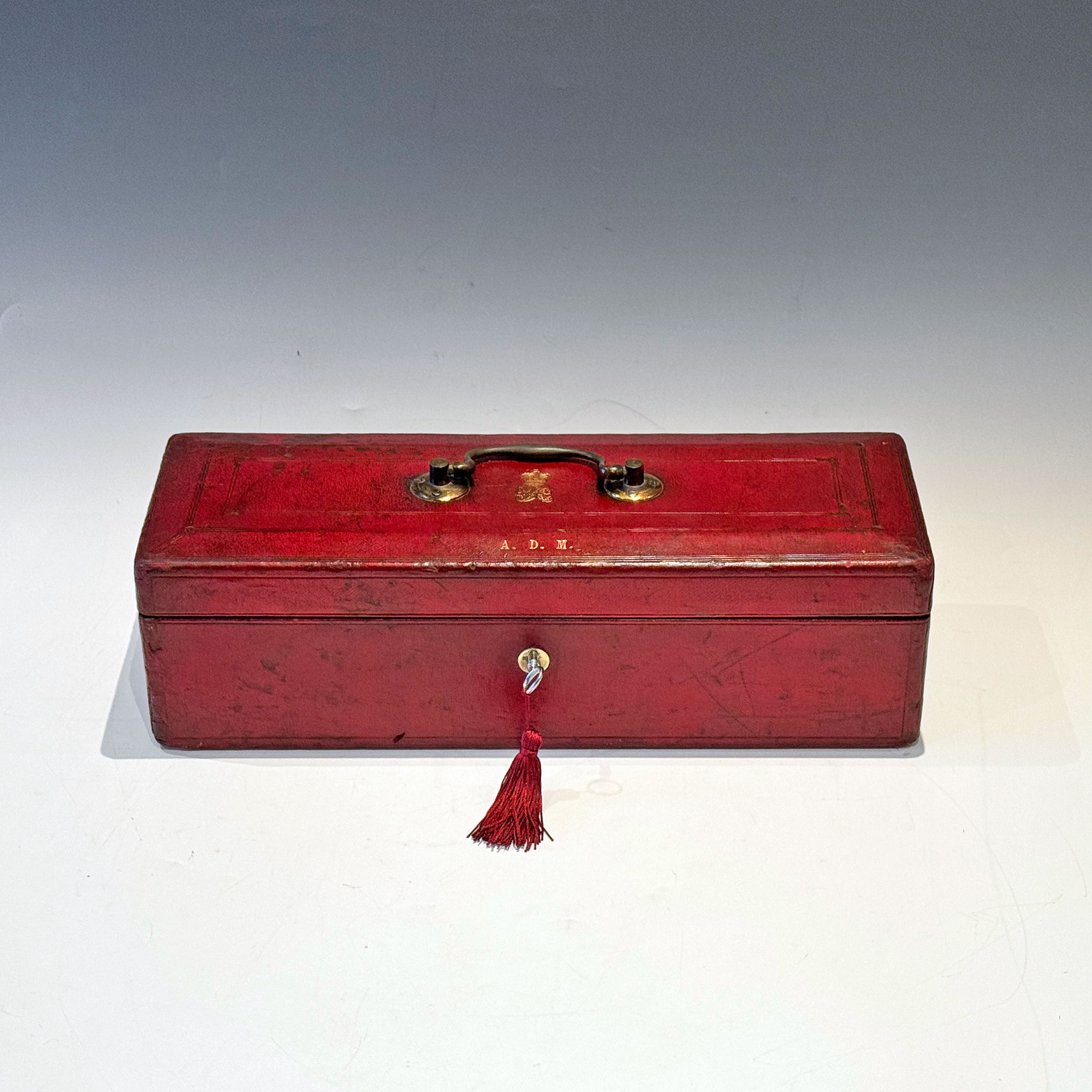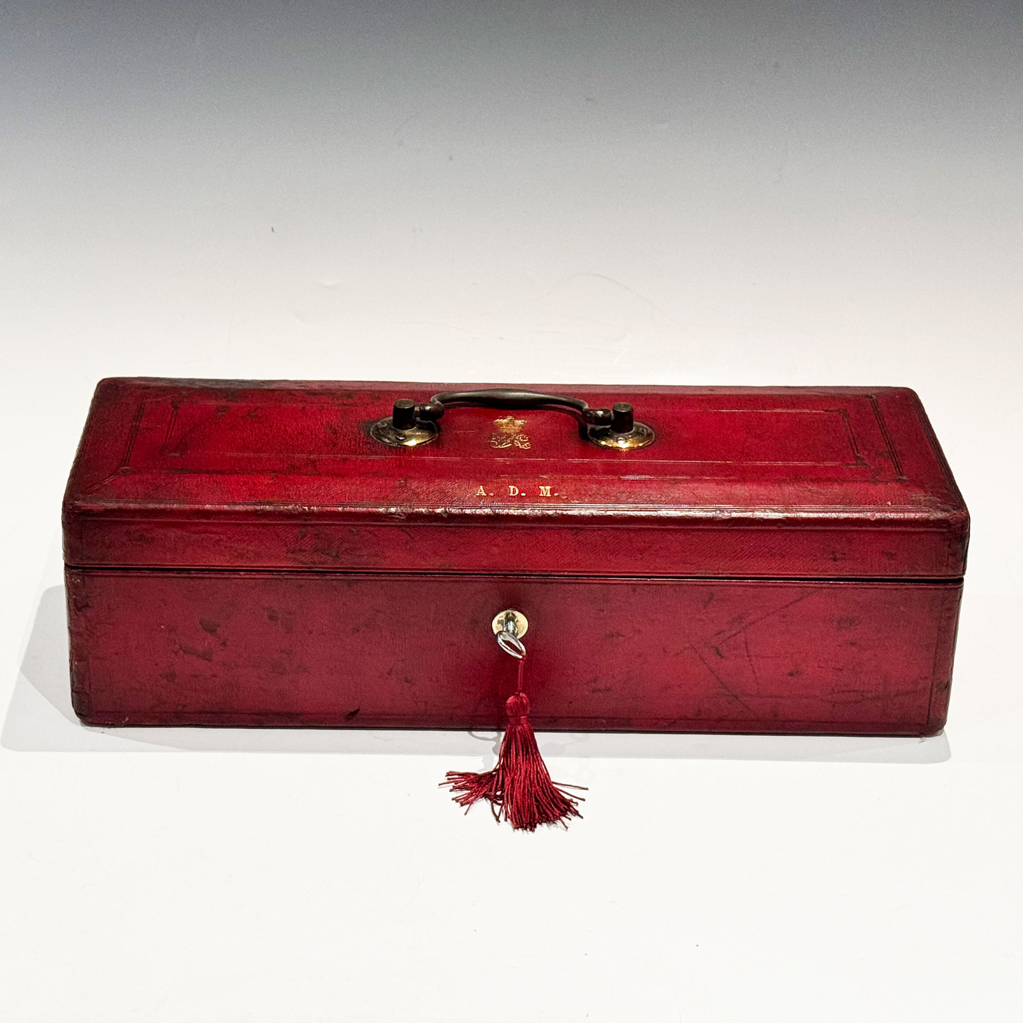 An unusual Mid Victorian Red Morocco Leather Clad Despatch Box of oblong form measuring 48 x 16 x 14 cm, the chamfered top is embossed with Queen Victoria’s cipher and the initials A.D.M, and is mounted with a central swing handle. The black leather lined interior features raised sides and bears the maker’s name & address either side of the lock.