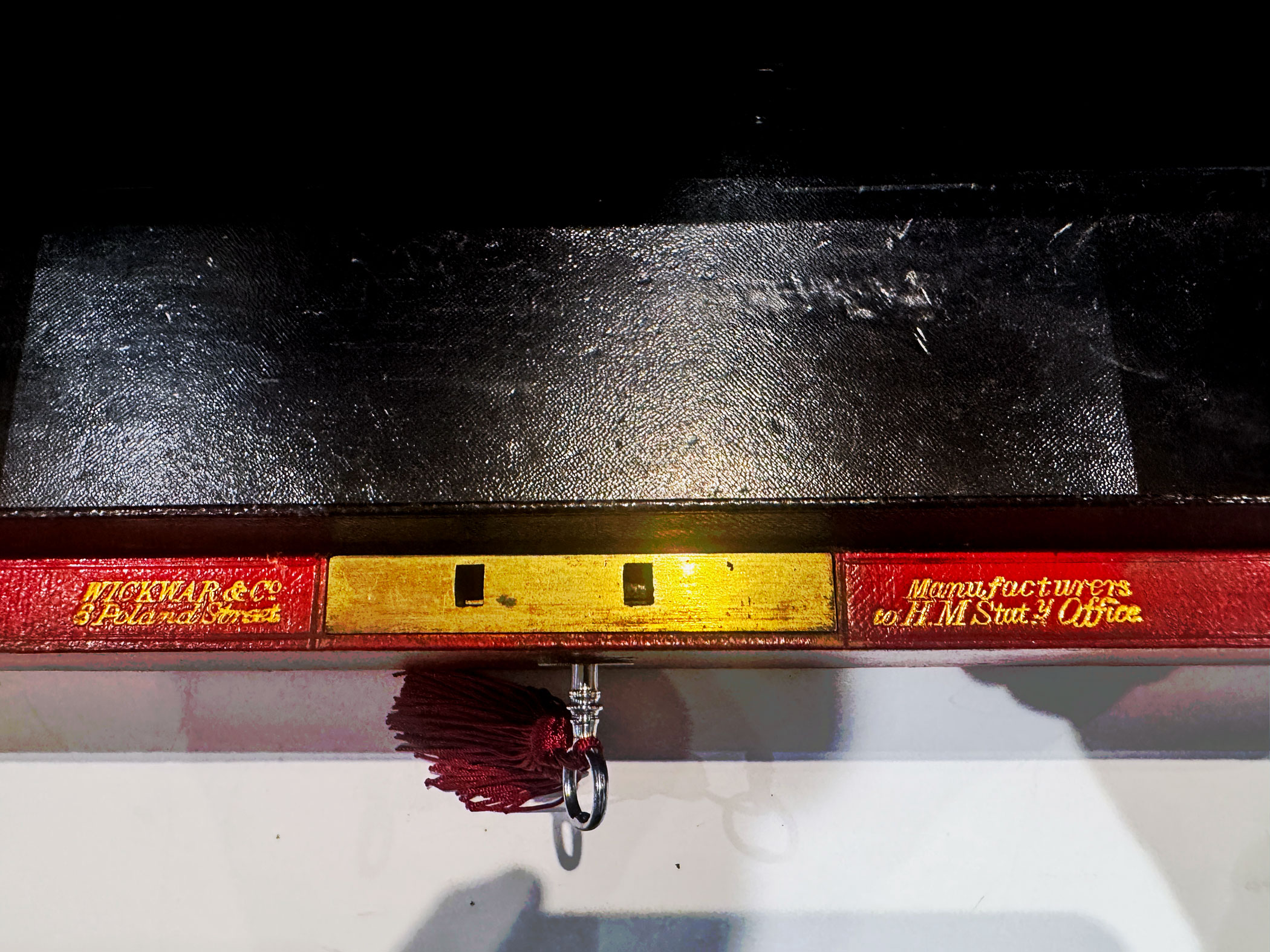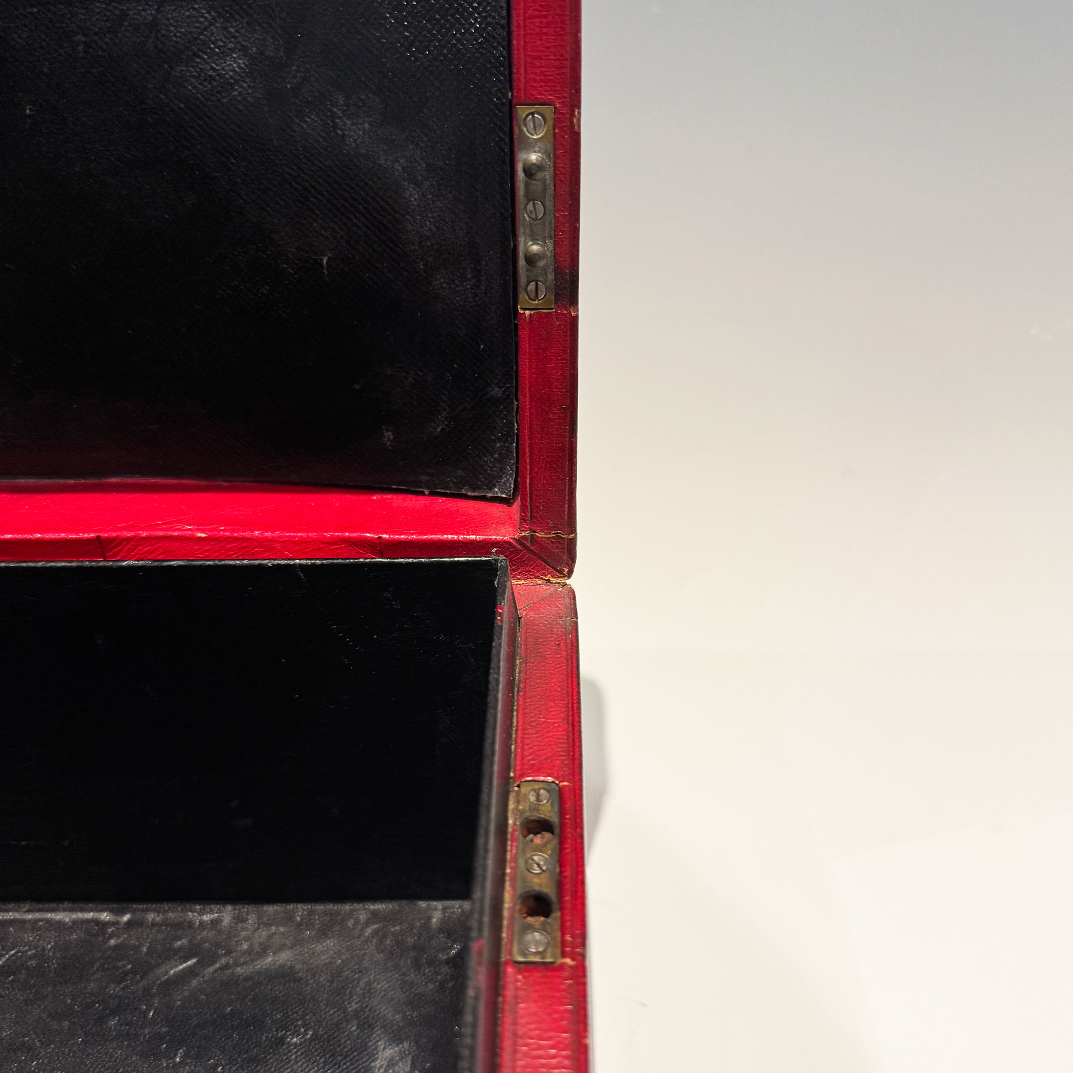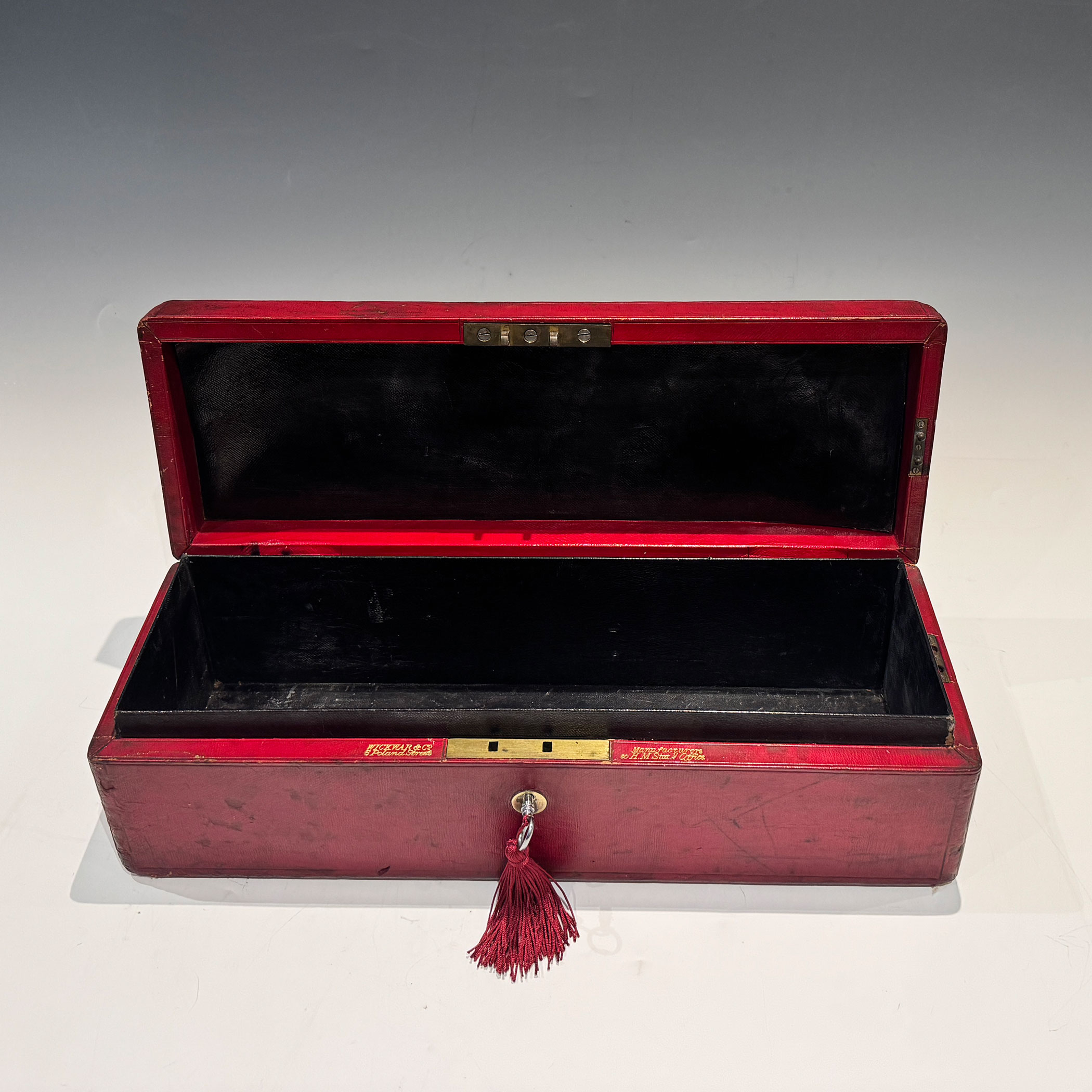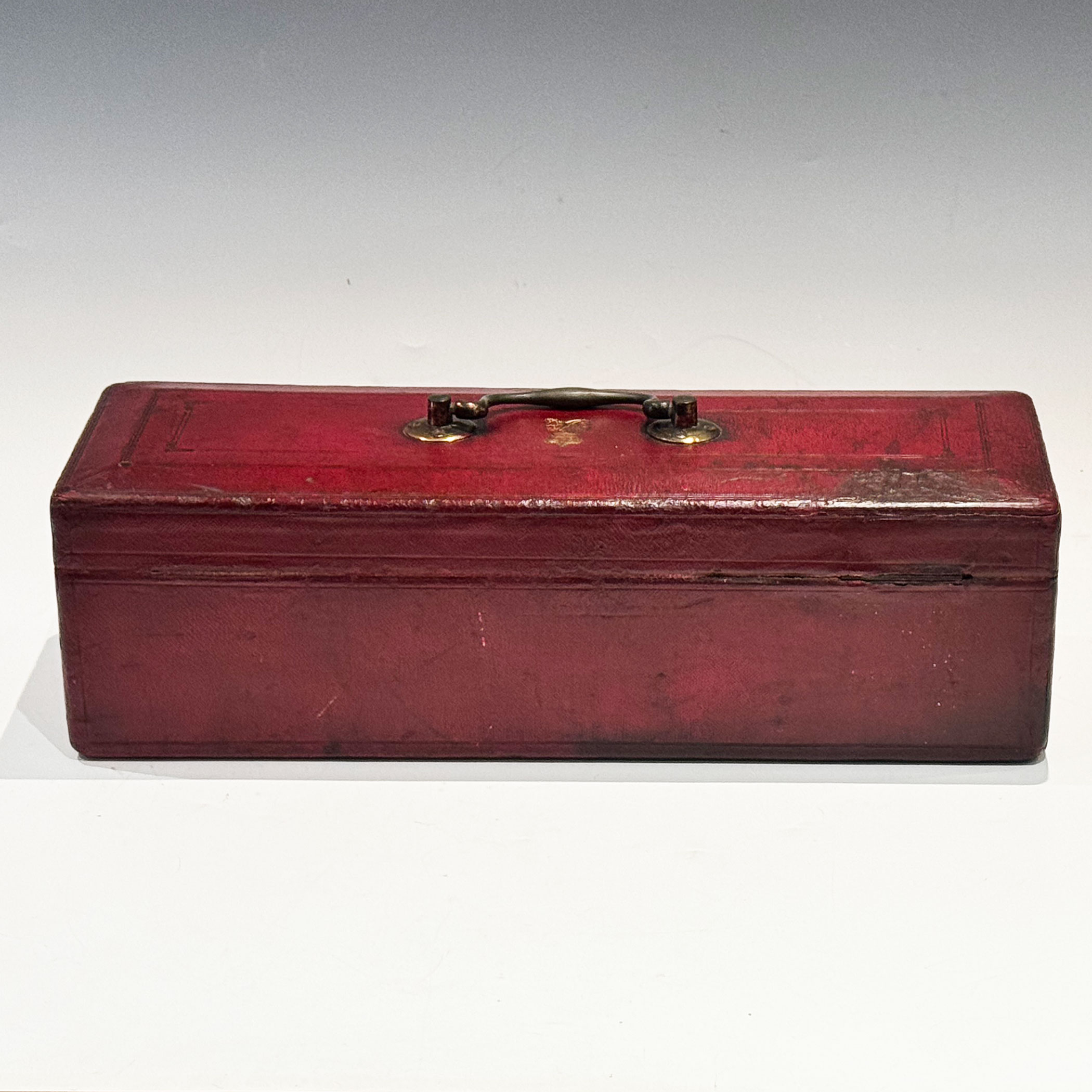 An unusual Mid Victorian Red Morocco Leather Clad Despatch Box of oblong form measuring 48 x 16 x 14 cm, the chamfered top is embossed with Queen Victoria’s cipher and the initials A.D.M, and is mounted with a central swing handle. The black leather lined interior features raised sides and bears the maker’s name & address either side of the lock.